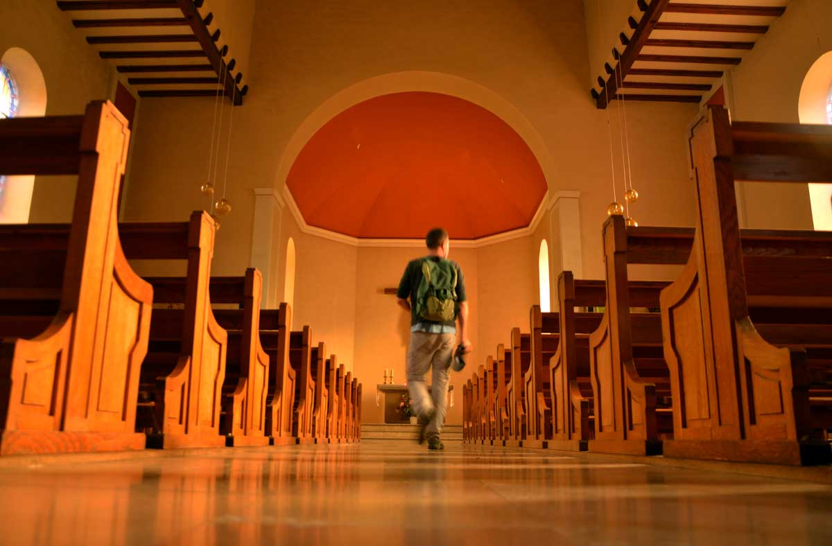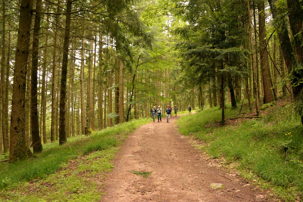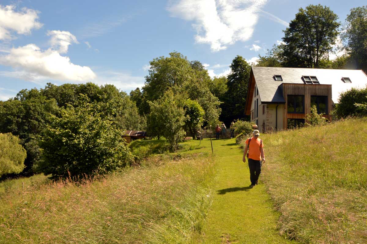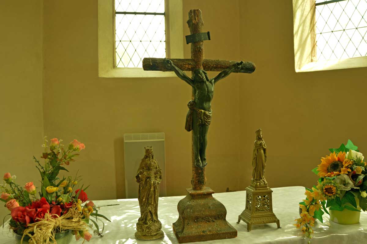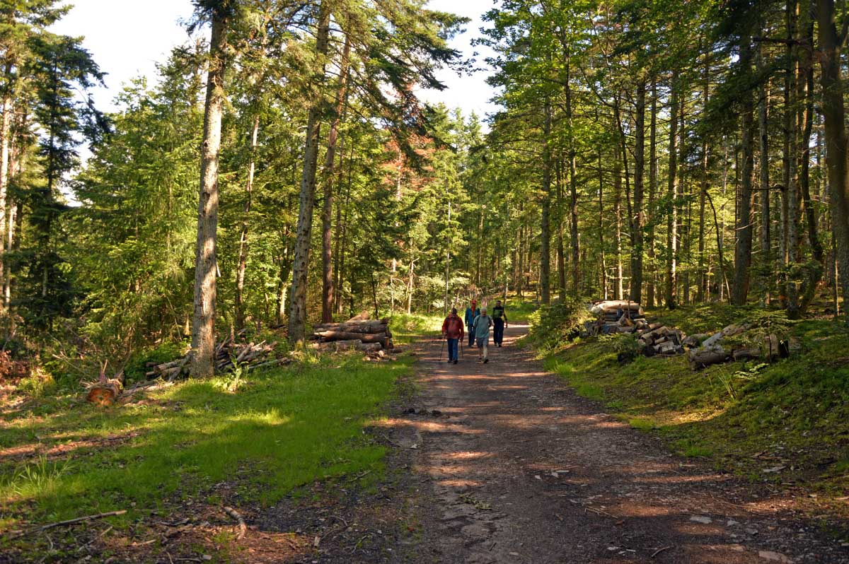Donc nous quittâmes les Trois Epis par un soleil radieux et nous folâtrâmes à travers prés et forêts pour rejoindre Labaroche Eglise et son église Saint-Michel, avant de monter vers Labaroche tout court au-dessus de la Basse Baroche… Nous tentâmes de ne point nous démonter le cervelet avec ces roches et admirâmes la sobre chapelle Saint-Wandrille à Labaroche, avant de passer devant l’étrange église Saint-Joseph, sorte de bunker (d’ailleurs elle a été financée avec les dommages de guerre) érigé sur un truc déjà existant…