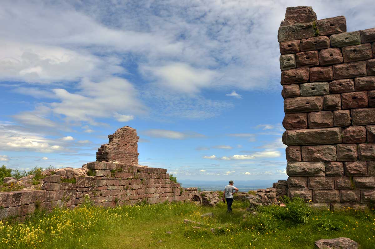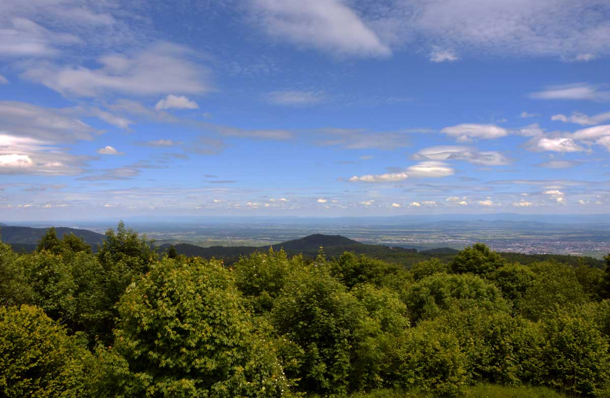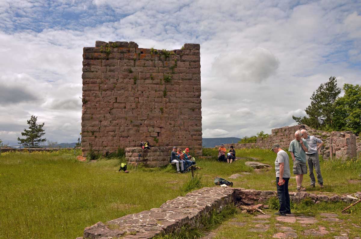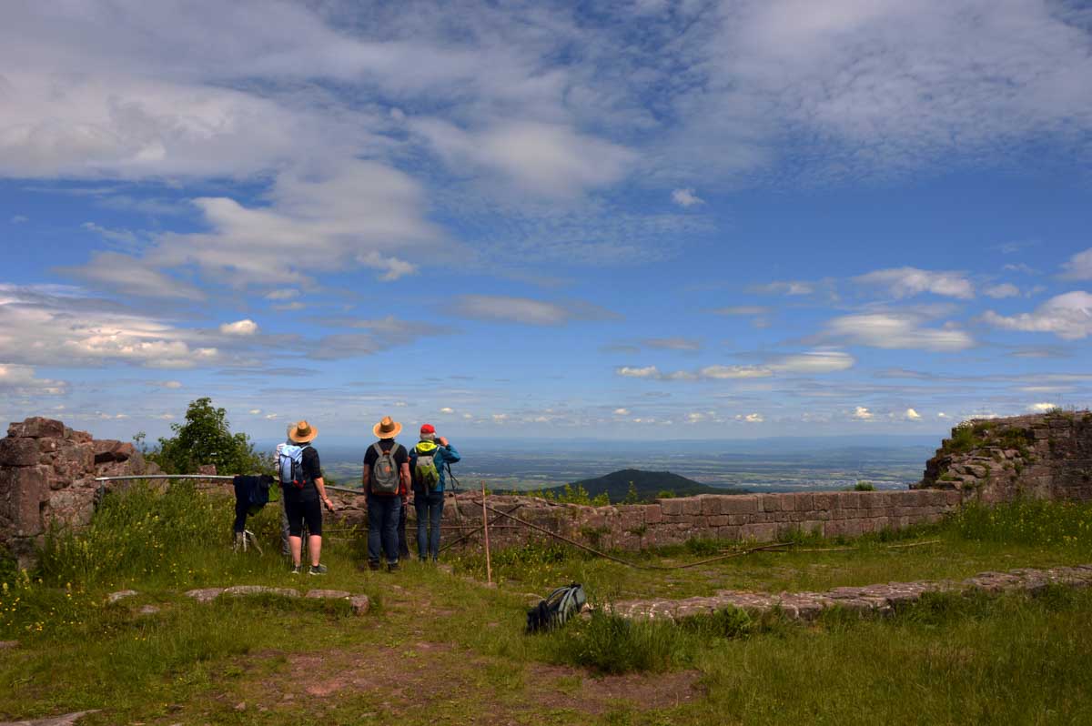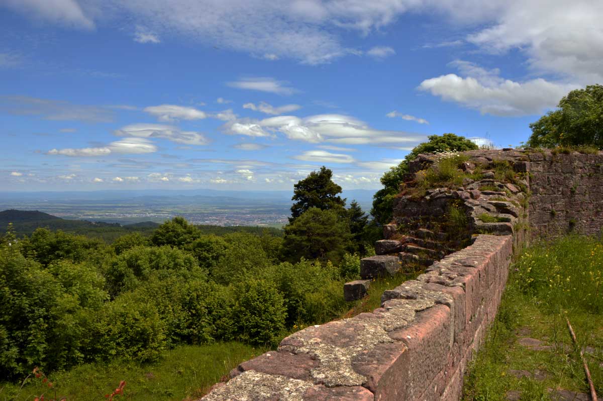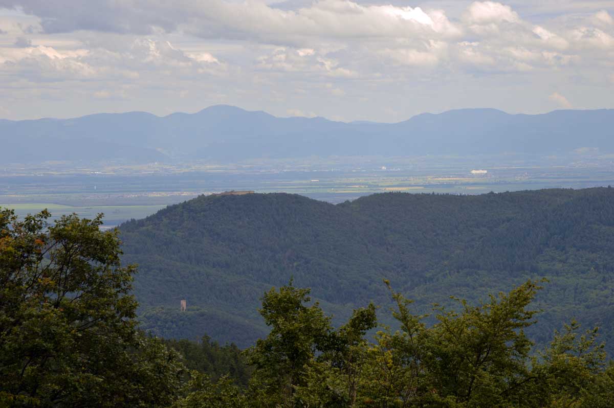 Et voilà, je sais plus où j’en étais… Ah oui, quand on a commencé à grimper dans la forêt, j’ai eu un doute. Quand j’ai vu un bout de caillasse, j’avais plus de doute. Et quand j’ai vu la chose apparaître dans la clairière, je me rappelais plus avoir eu un doute. La fatigue, sans doute. Bref, la ruine du Hohnack. Au moins j’ai profité de la vue sur la Forêt-Noire qui, encore une fois, est bleue ; sur le Kaiserstuhl, sur la plaine d’Alsace, sur Colmar et tout le nord du Haut-Rhin qui, comme tu sais, se trouve au sud du sud du Bas-Rhin.