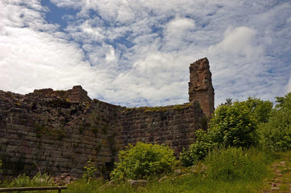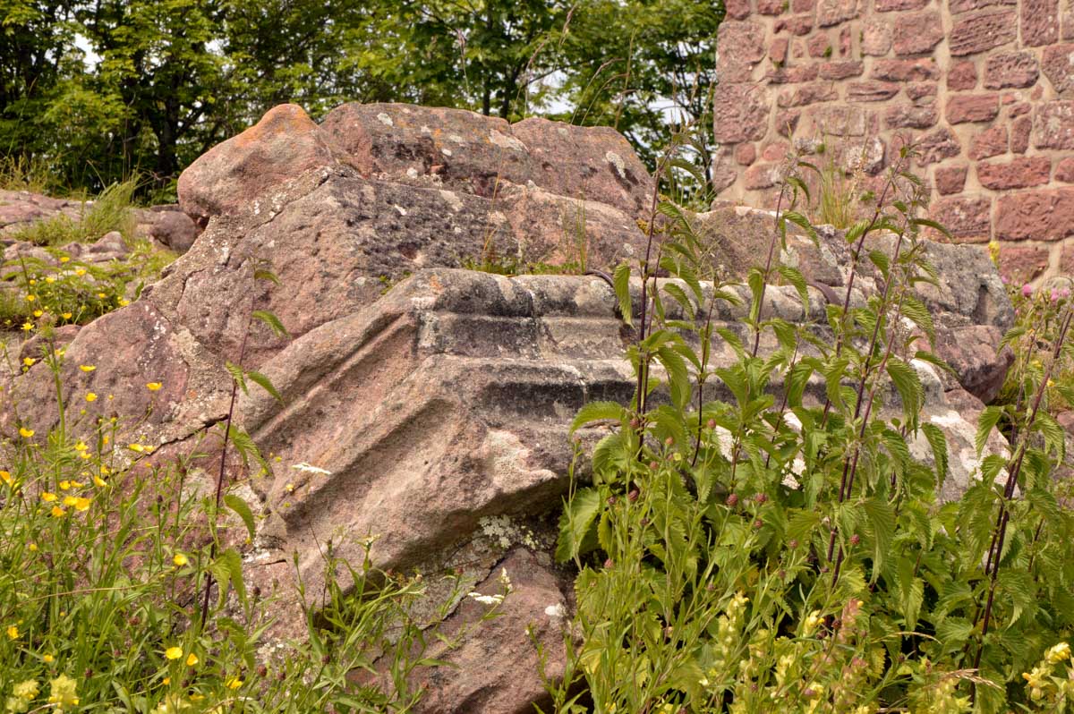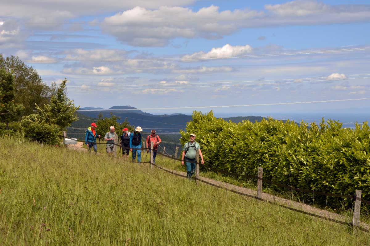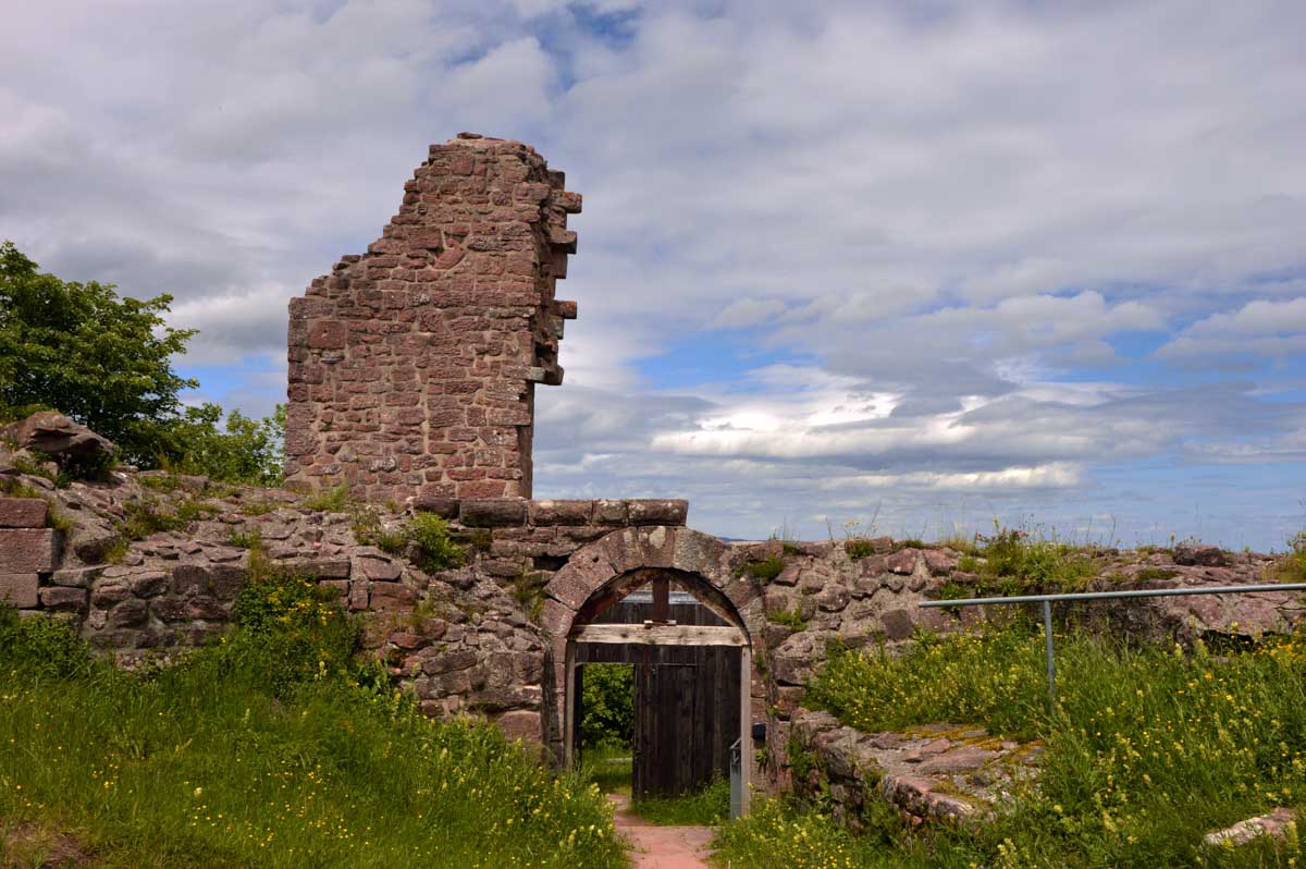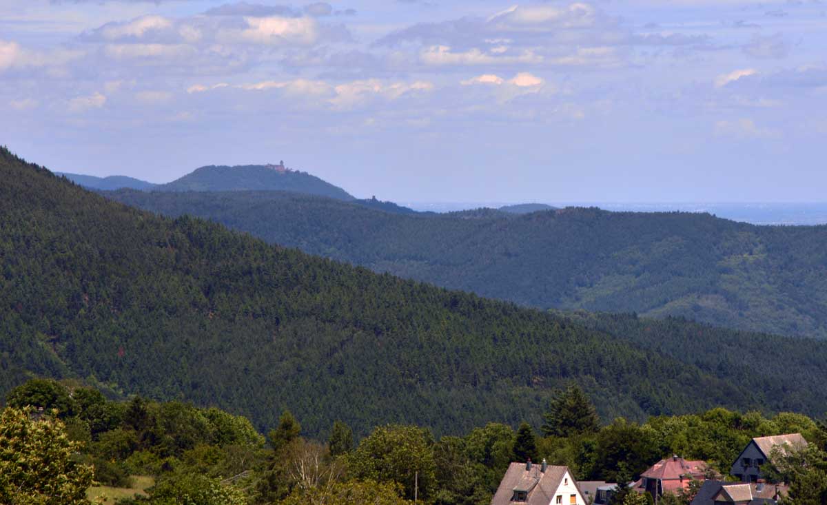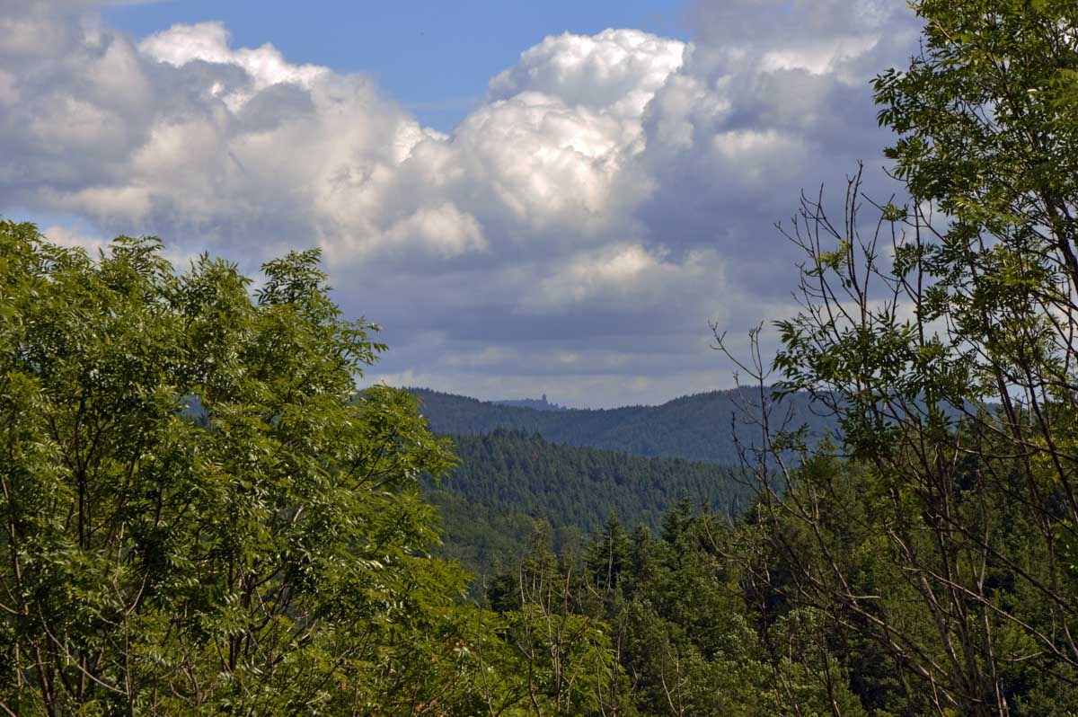 Et voilà, je sais plus où j’en étais… Ah oui, quand on a commencé à grimper dans la forêt, j’ai eu un doute. Quand j’ai vu un bout de caillasse, j’avais plus de doute. Et quand j’ai vu la chose apparaître dans la clairière, je me rappelais plus avoir eu un doute. La fatigue, sans doute. Bref, la ruine du Hohnack. Au moins j’ai profité de la vue sur la Forêt-Noire qui, encore une fois, est bleue ; sur le Kaiserstuhl, sur la plaine d’Alsace, sur Colmar et tout le nord du Haut-Rhin qui, comme tu sais, se trouve au sud du sud du Bas-Rhin.