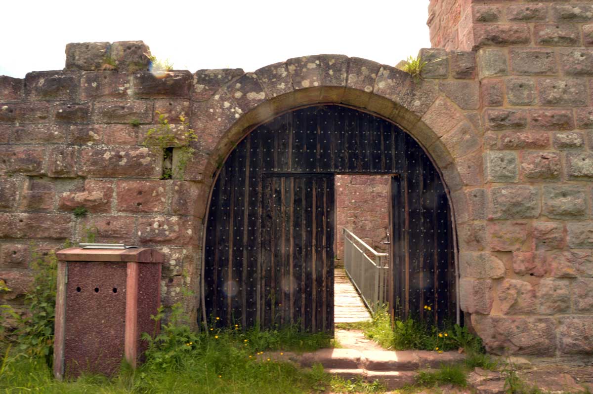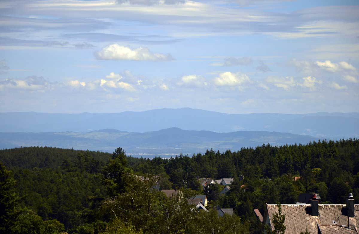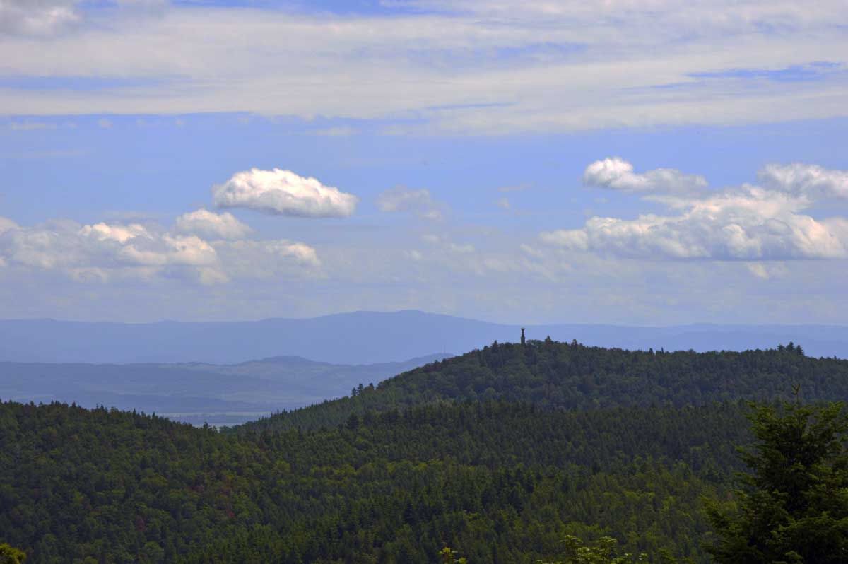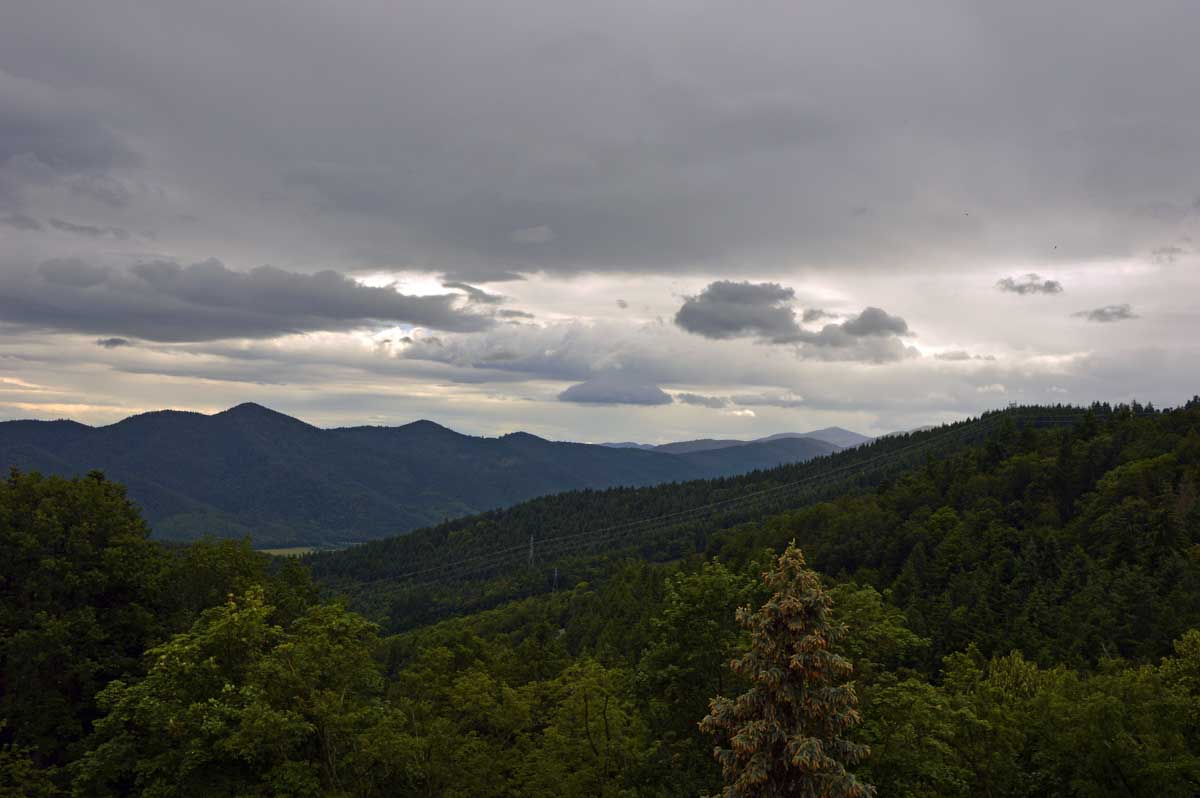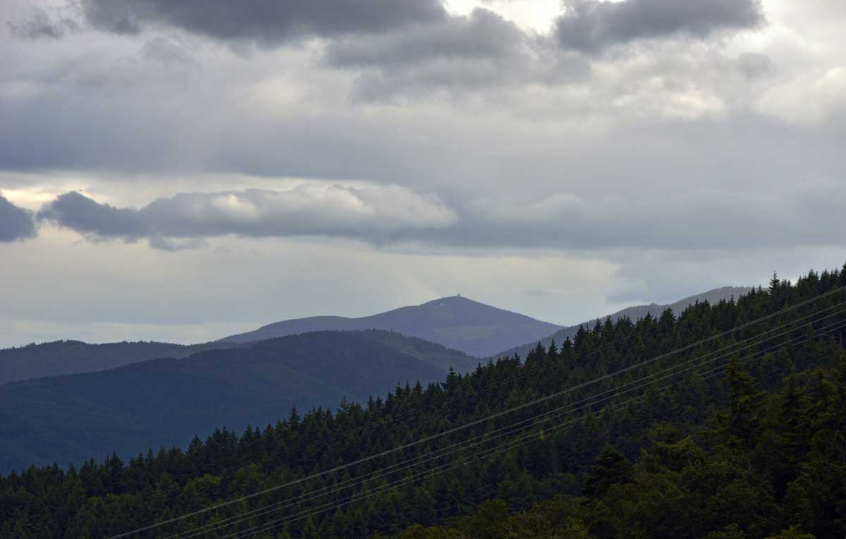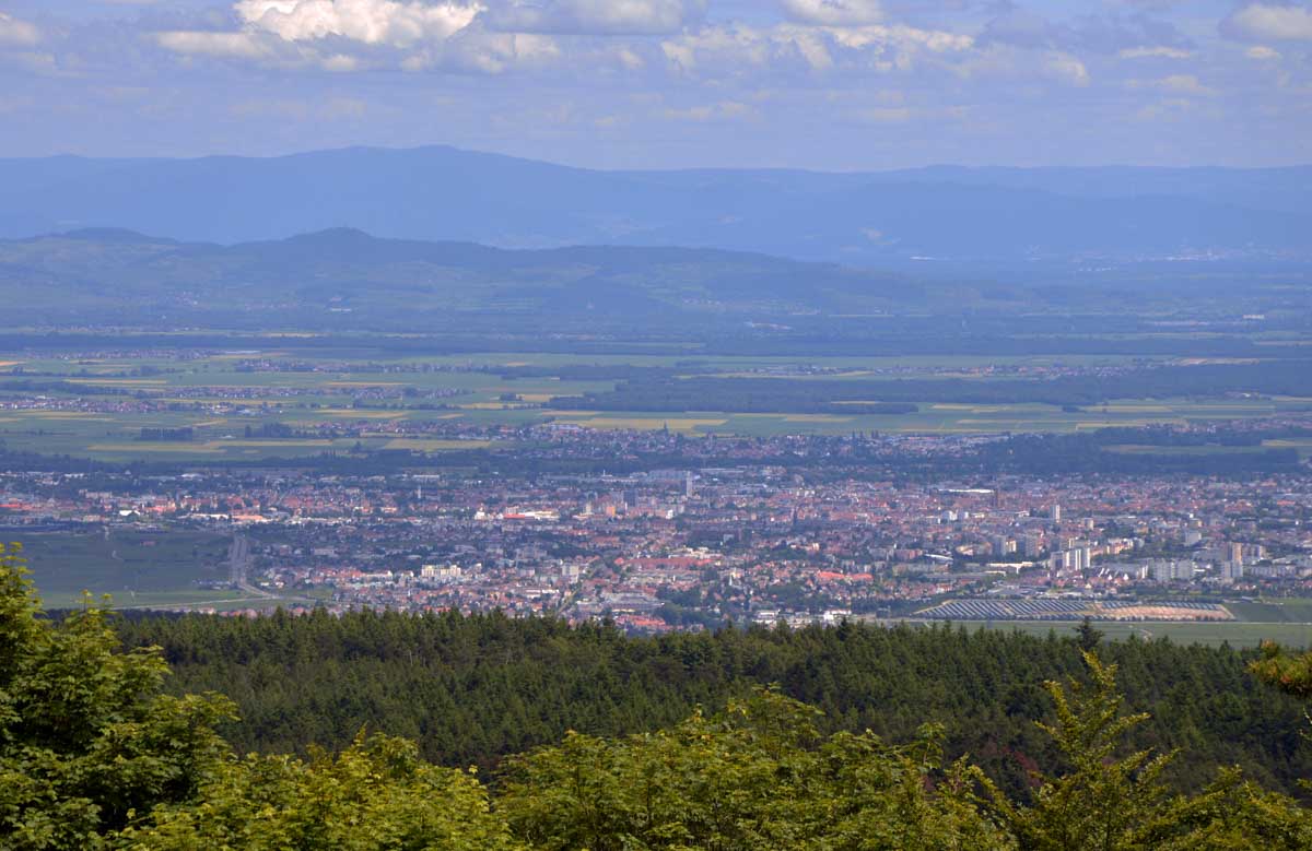 Et voilà, je sais plus où j’en étais… Ah oui, quand on a commencé à grimper dans la forêt, j’ai eu un doute. Quand j’ai vu un bout de caillasse, j’avais plus de doute. Et quand j’ai vu la chose apparaître dans la clairière, je me rappelais plus avoir eu un doute. La fatigue, sans doute. Bref, la ruine du Hohnack. Au moins j’ai profité de la vue sur la Forêt-Noire qui, encore une fois, est bleue ; sur le Kaiserstuhl, sur la plaine d’Alsace, sur Colmar et tout le nord du Haut-Rhin qui, comme tu sais, se trouve au sud du sud du Bas-Rhin.