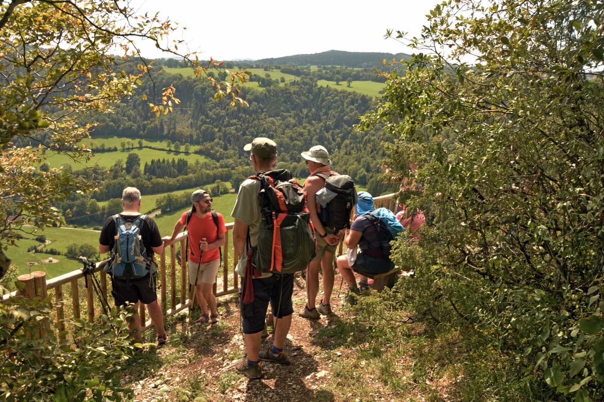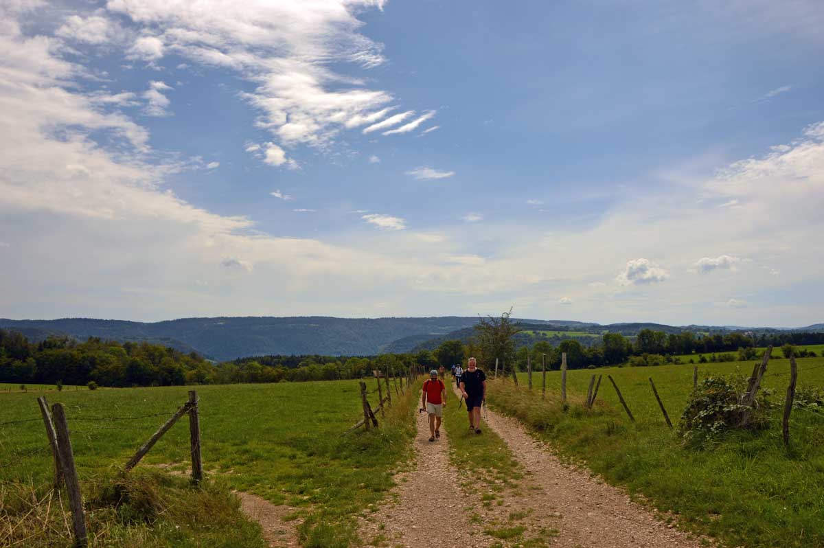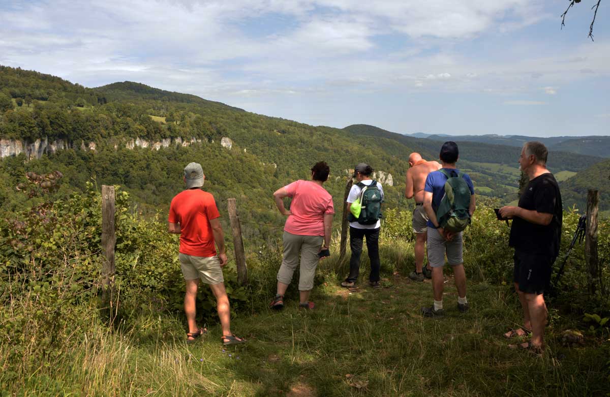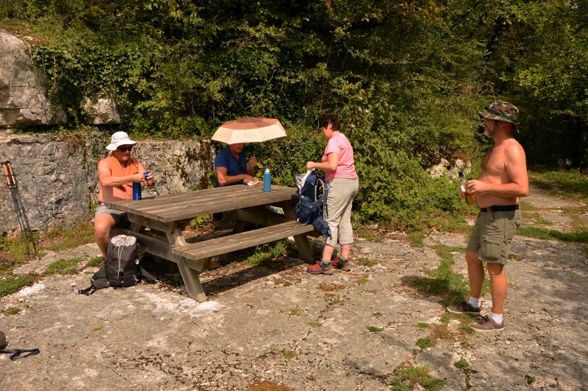 Blasés je vous dis, juste un « ouais bon » devant l’abbaye du village devenue prieuré. Il ne fallait pas espérer échapper à un belvédère, puisqu’on a eu celui du Baron d’Ambon avec vue sur la Vallée du Dessoubre. C’est un affluent du Doubs. L’occasion de goûter le rosé pamplemousse qui me narguait depuis la veille. Ma foi, bien frais, ça passe ; toujours mieux que le régime sec, hein.
