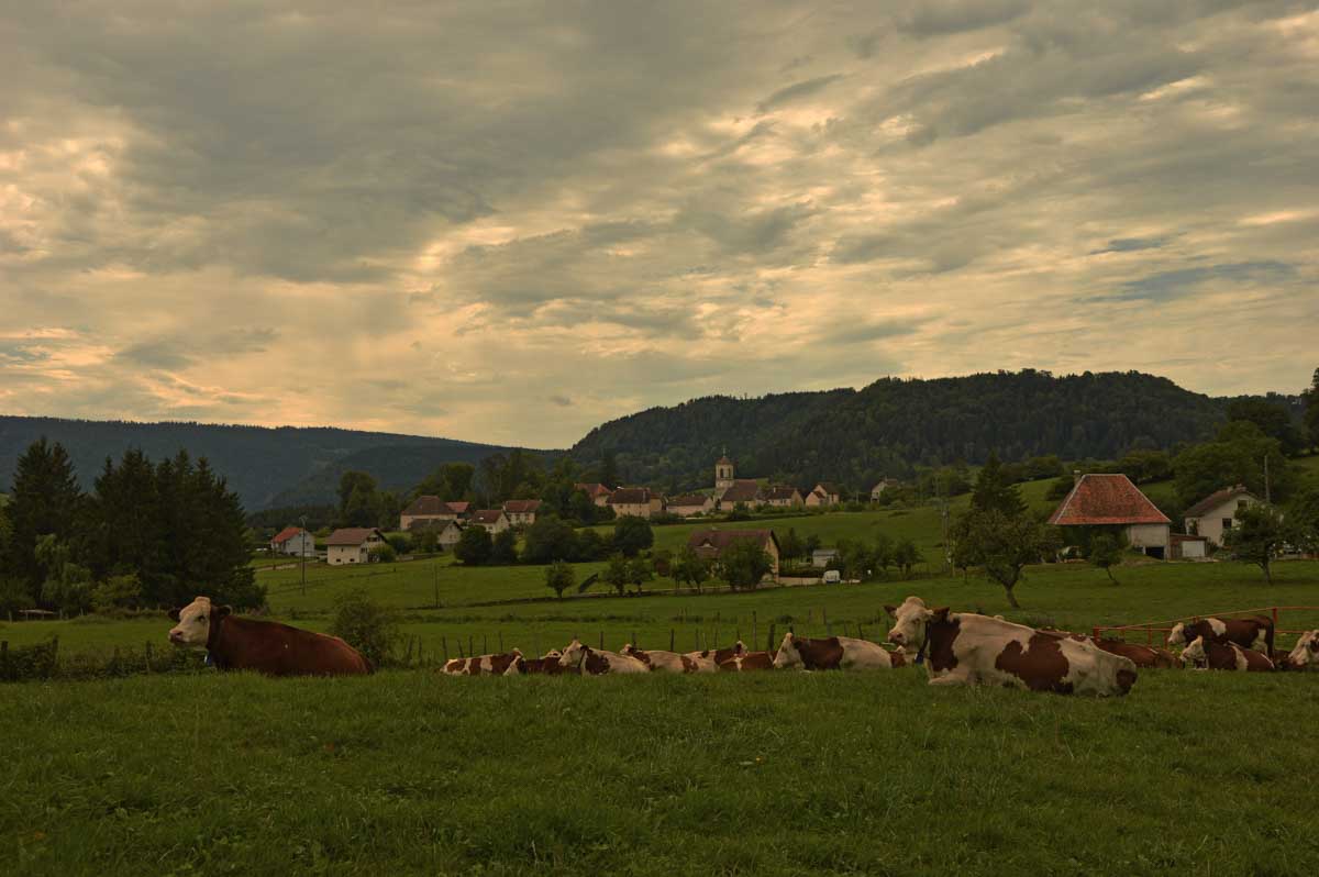Aujourd’hui non plus, pas de chien mais que de vaches ! De la belle brune et blanche dont la seule occupation est de manger et se faire traire. Moi je te le dis, dans ma prochaine vie… Je garantis pas qu’on en fera du comté, mais l’intention y est !