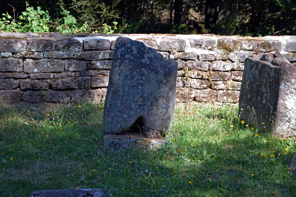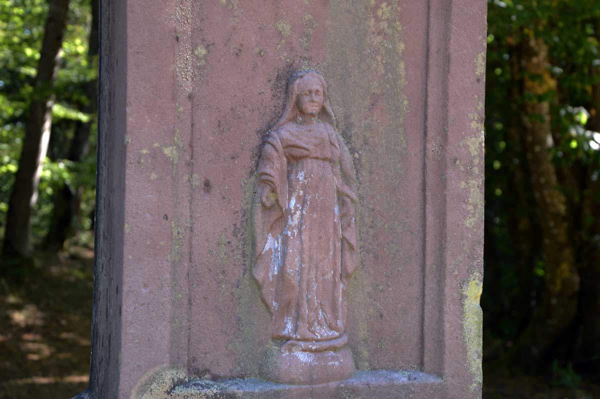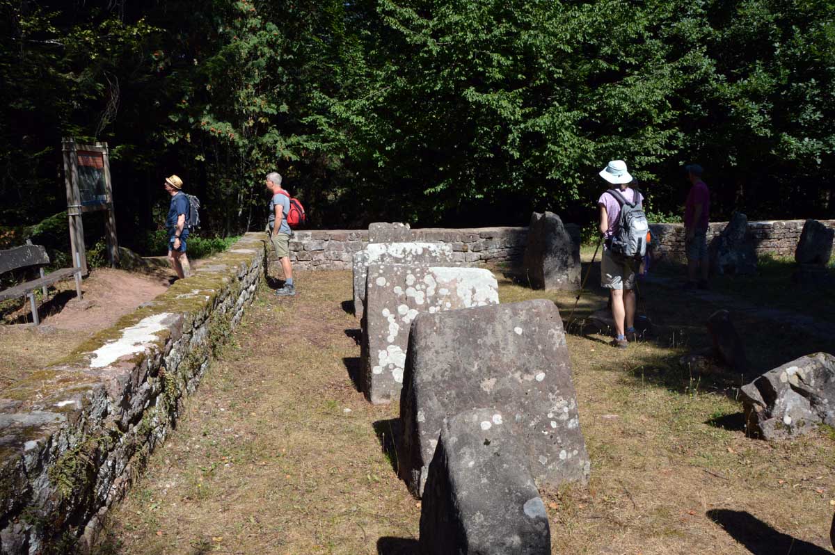 Place d’abord à la nature et à la spiritualité, avec des croix dont le socle porte des ornements particulièrement riches, entre deux sentiers forestiers ombragés. Puis le cimetière des Trois-Saints, perdu dans la forêt, où des archéologues du XIXème siècle ont rassemblé des pierres tombales disséminées autour de Beimbach et datant de deux-mille ans, en forme de maison et disposant d’une ouverture à leur base pour permettre la communication entre le monde des vivants et celui des morts. Ou accessoirement de la boucher pour couper ce lien.