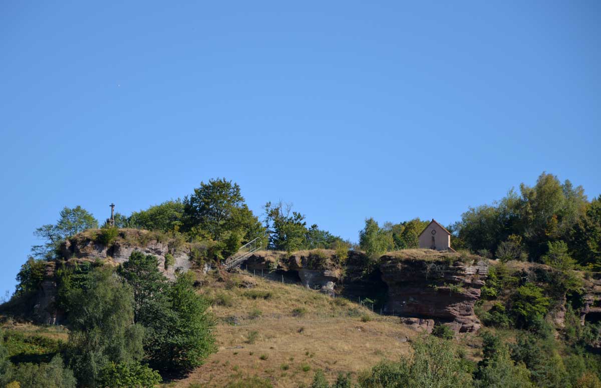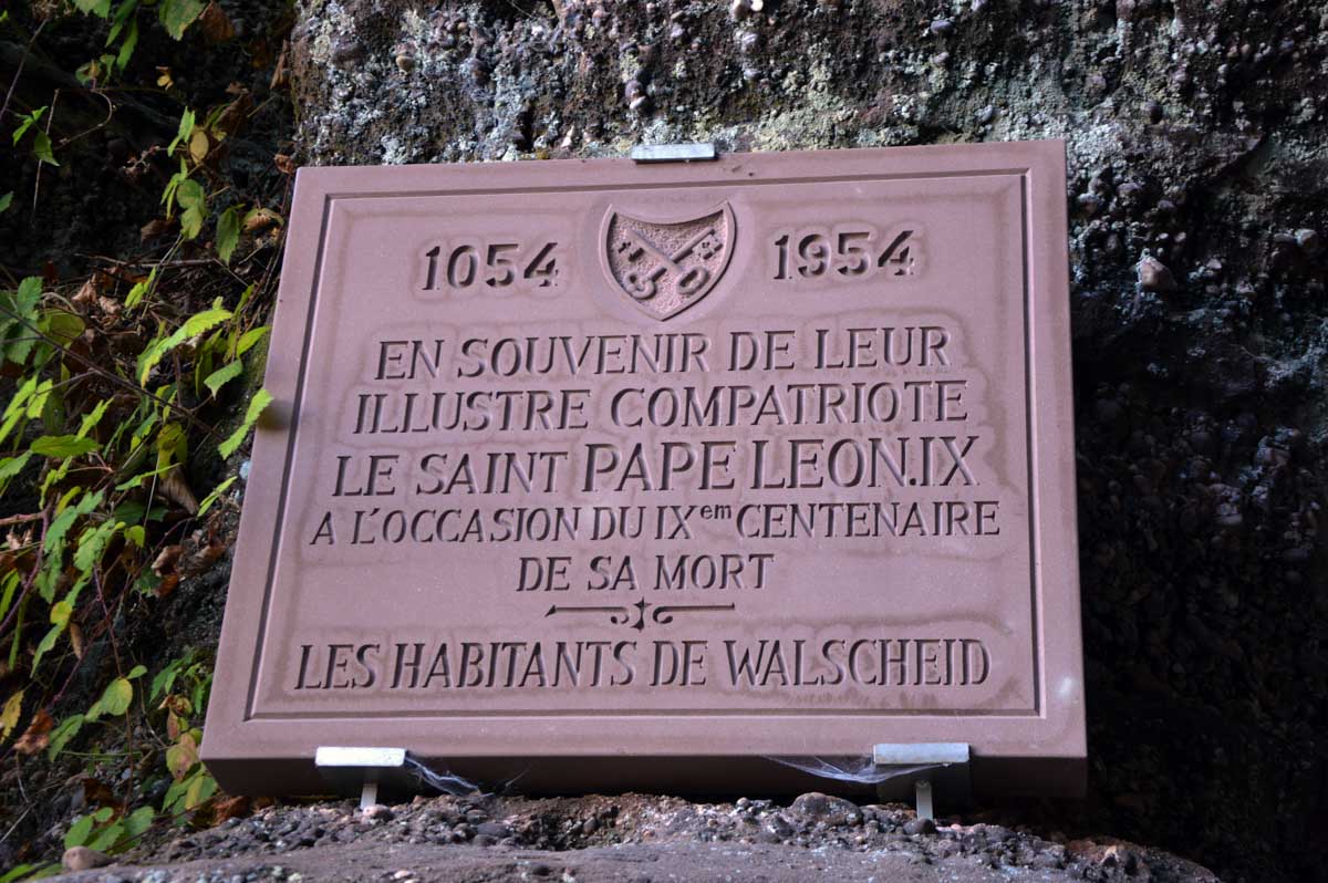 Bien que né à Eguisheim en 1002, le futur Léon IX aimait séjourner à Walscheid. Pape de 1048 à 1054, c’est donc à l’occasion du neuf-centième anniversaire de sa mort, en 1954, qu’on éleva la chapelle contemporaine qui porte son nom. Juste à côté de la grotte qui lui est dédiée. Il s’agit de la plus profonde cavité naturelle des Vosges, s’enfonçant à 32 mètres, sur une largeur de 24 et une hauteur de 8 mètres !