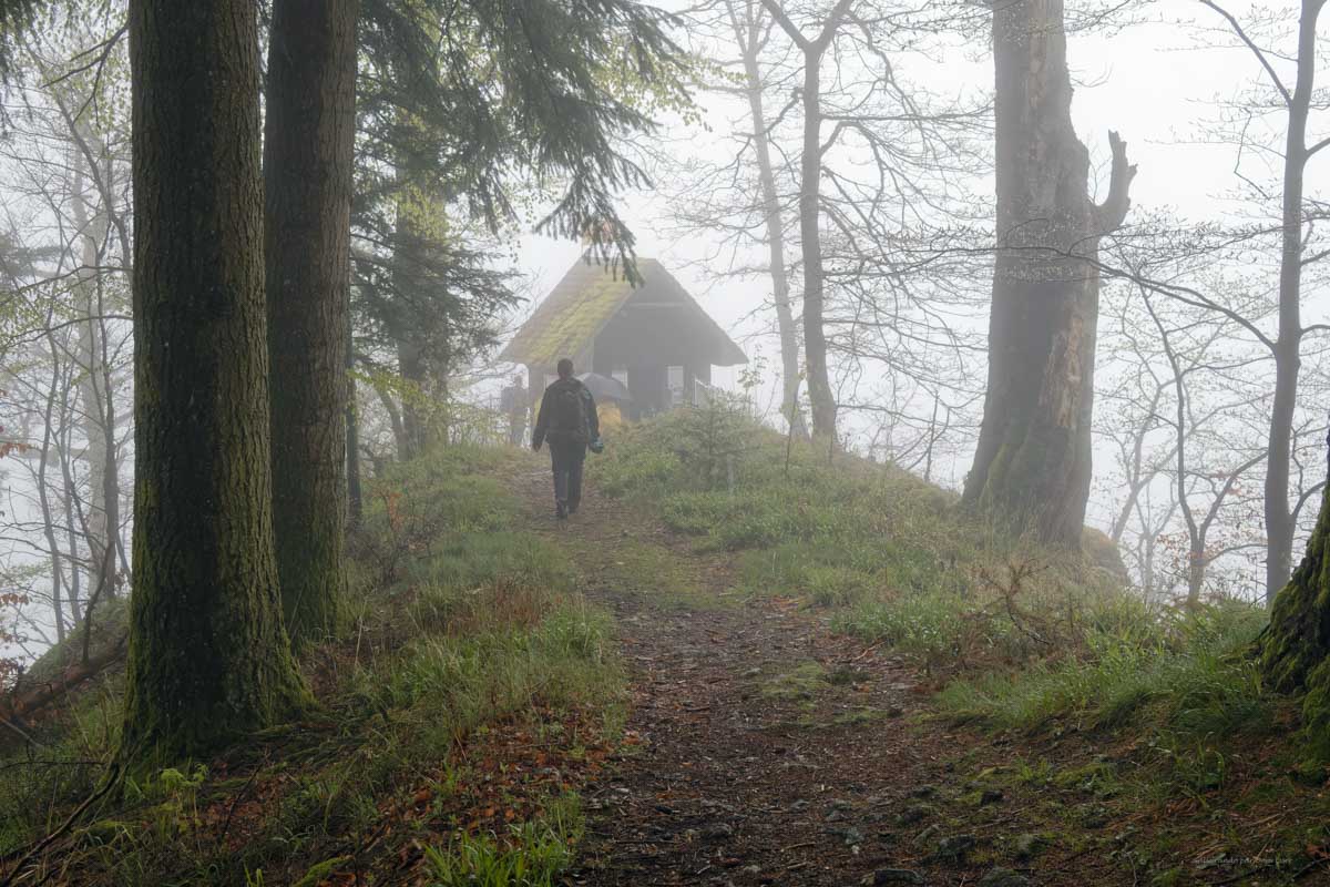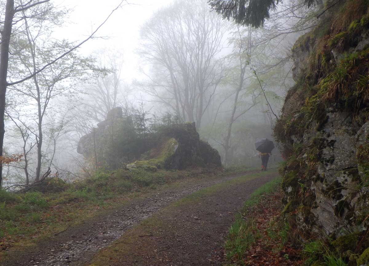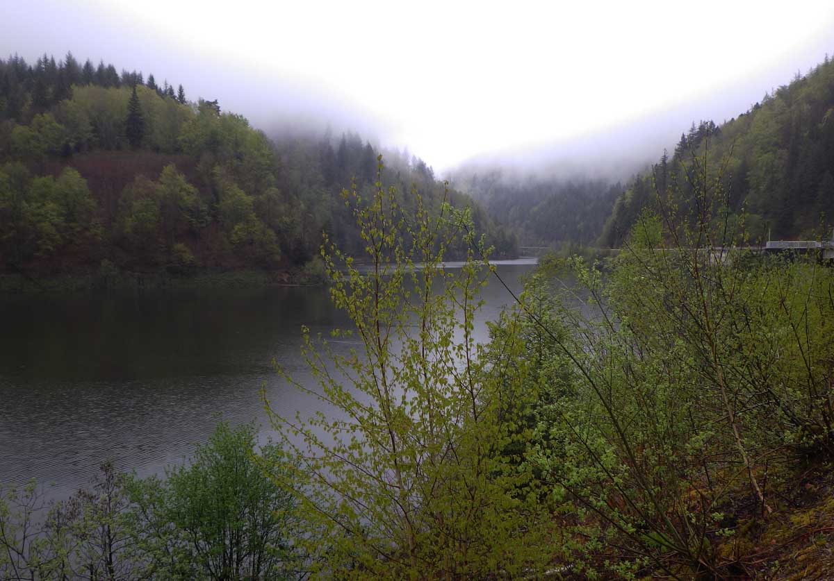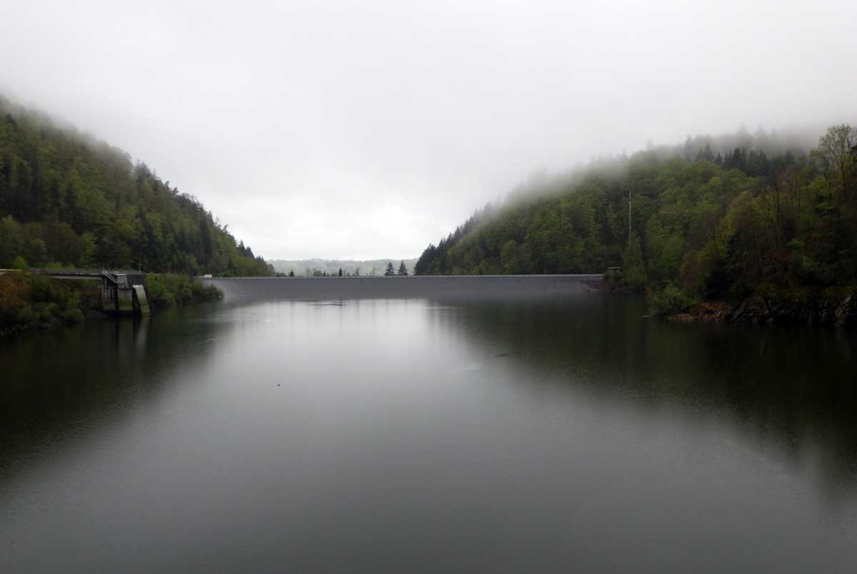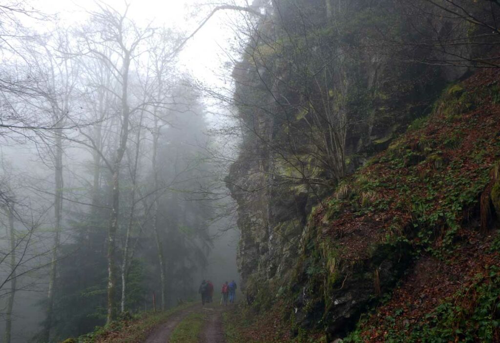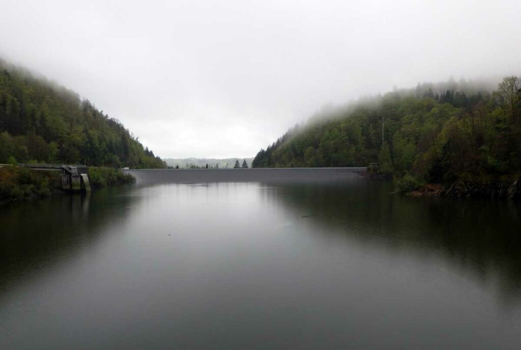 Ambiance brouillard et crachin au départ du lac du barrage de la Wehra, pour une douce montée dans un décor de forêt et de magnifiques rochers, avec des abris dont la Felsenhütte perchée comme une maison de contes de fées. De l’autre côté, sentier sauvage entre les torrents et retour par le barrage pour constater que le niveau du lac a baissé de plusieurs mètres en une seule journée.