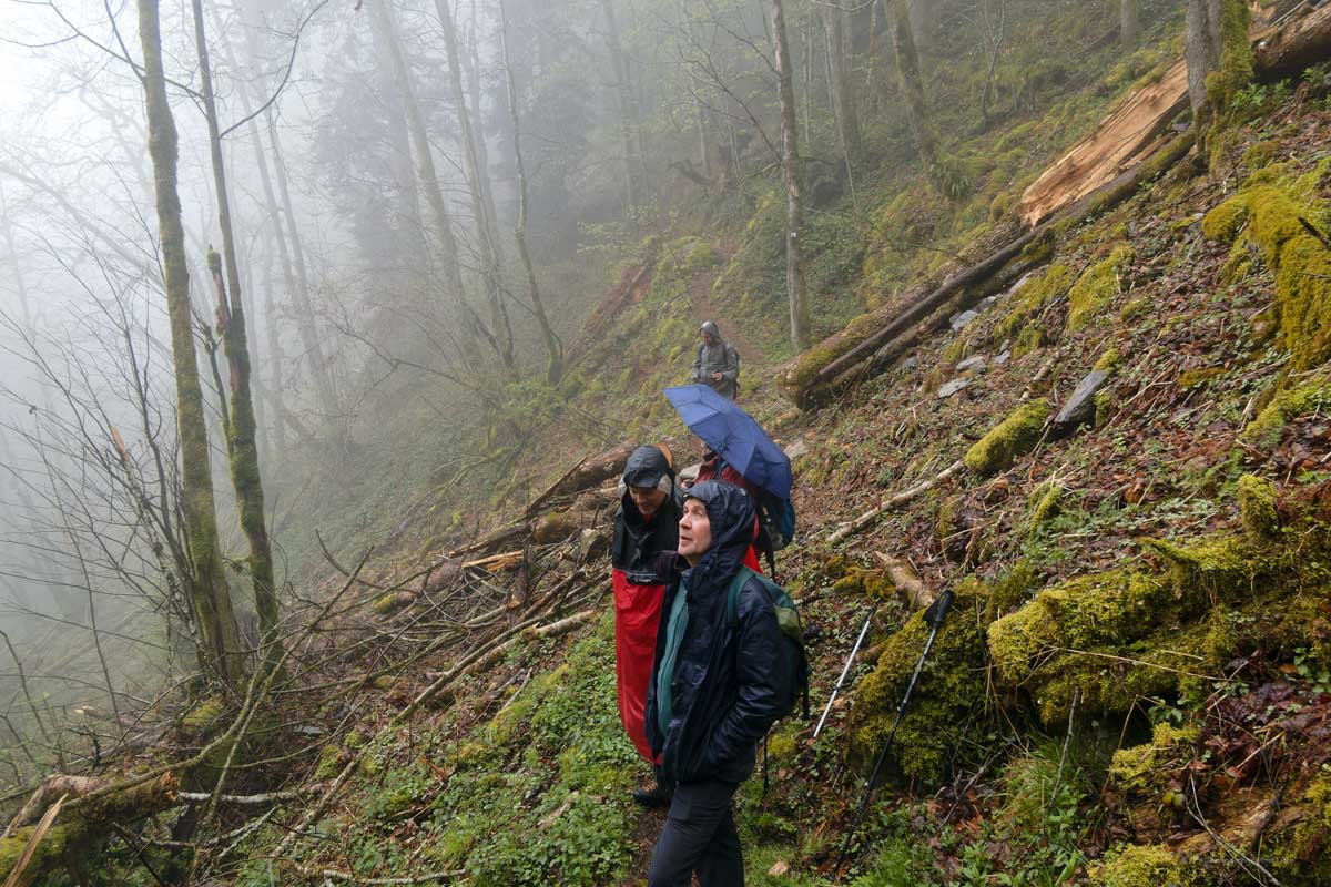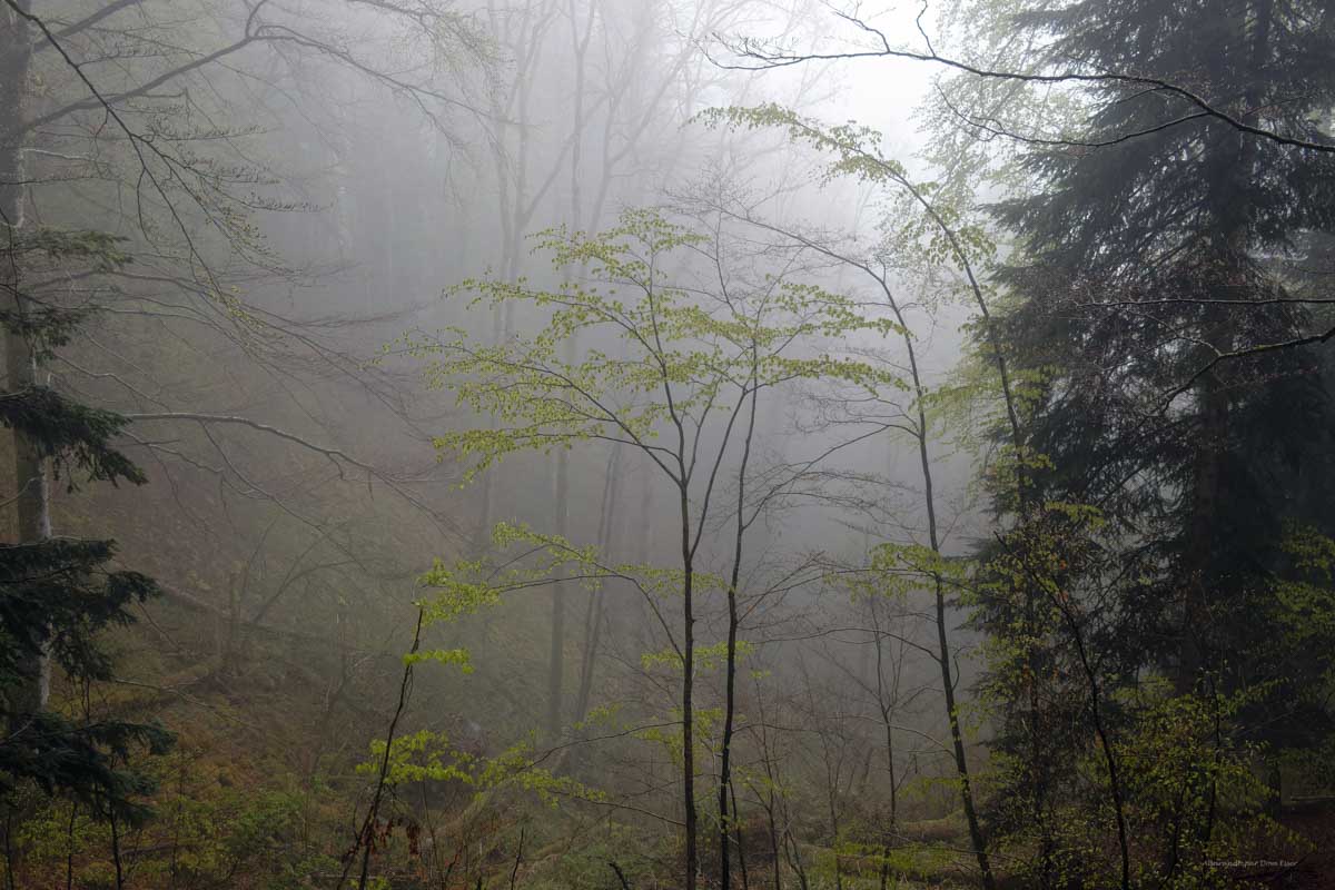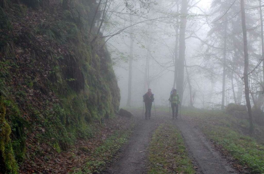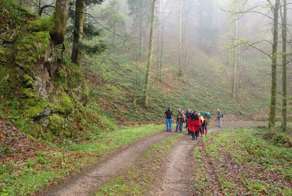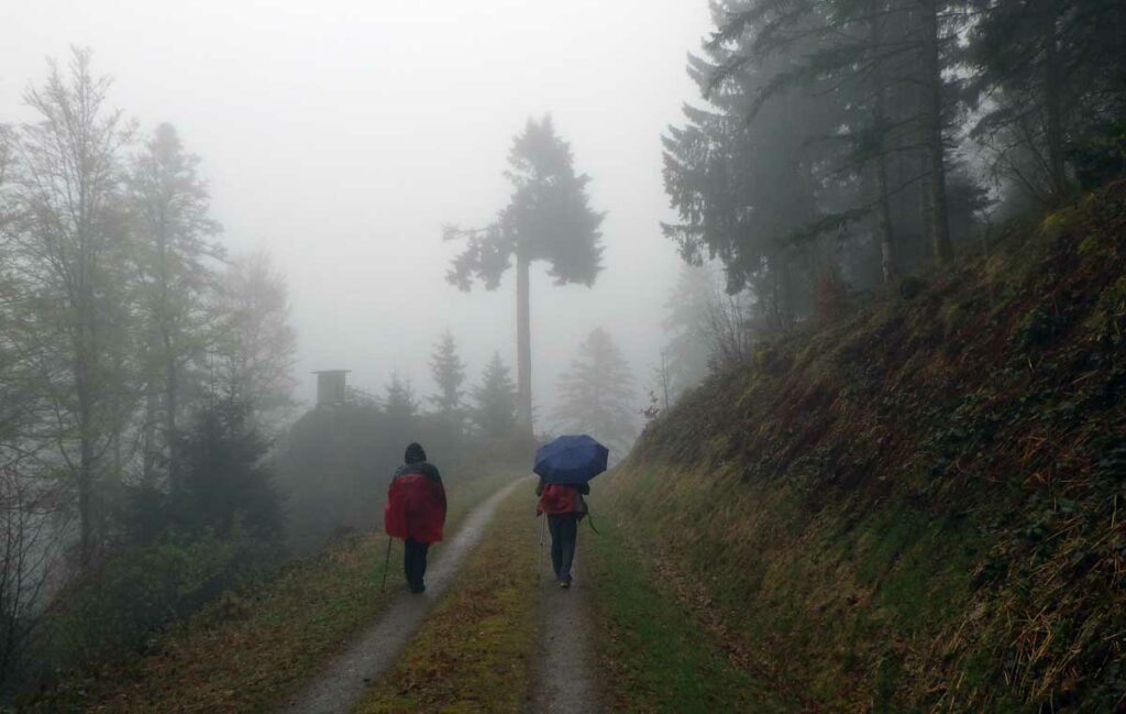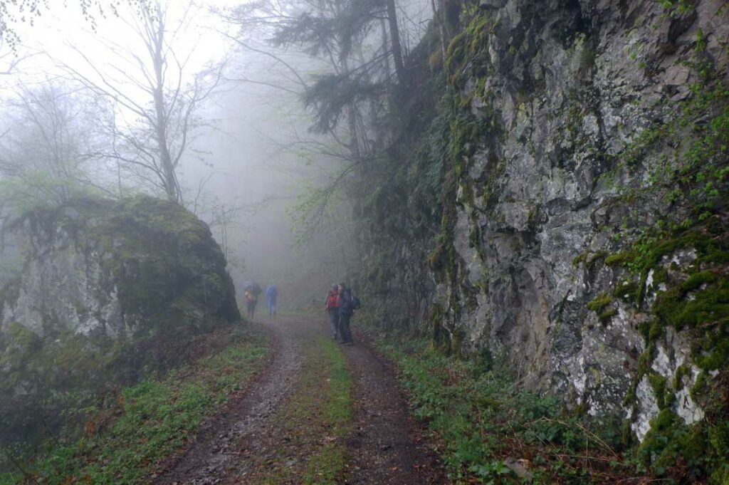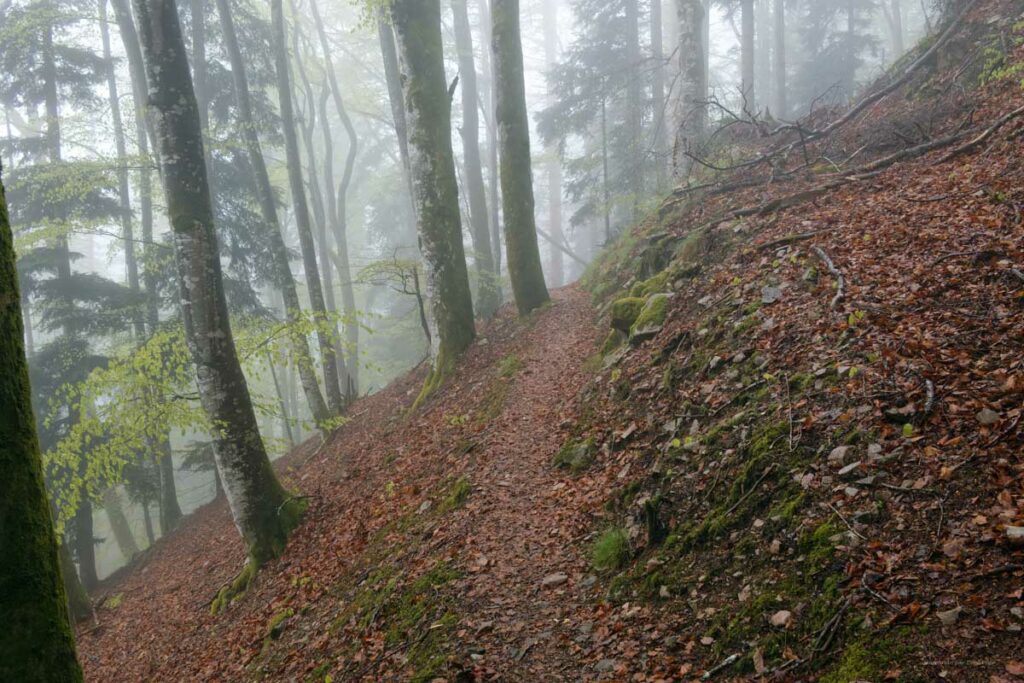 Ambiance brouillard et crachin au départ du lac du barrage de la Wehra, pour une douce montée dans un décor de forêt et de magnifiques rochers, avec des abris dont la Felsenhütte perchée comme une maison de contes de fées. De l’autre côté, sentier sauvage entre les torrents et retour par le barrage pour constater que le niveau du lac a baissé de plusieurs mètres en une seule journée.