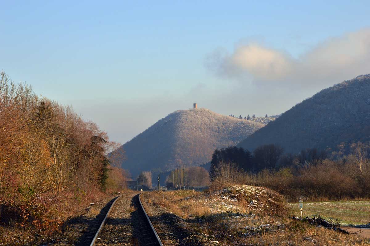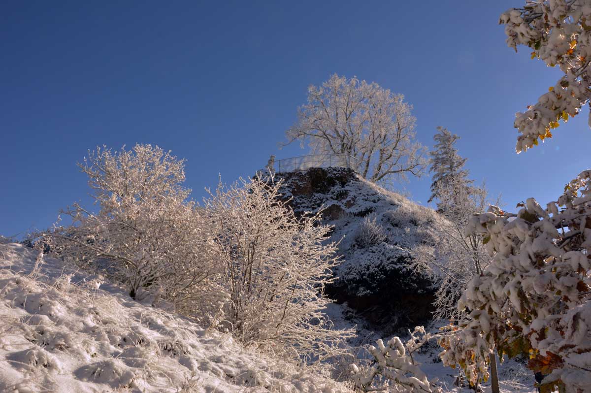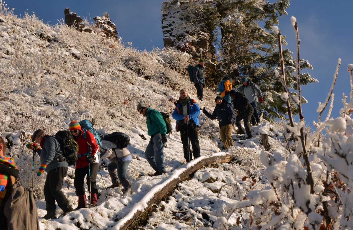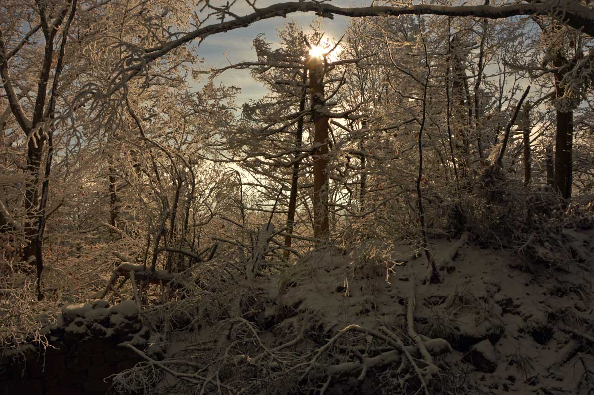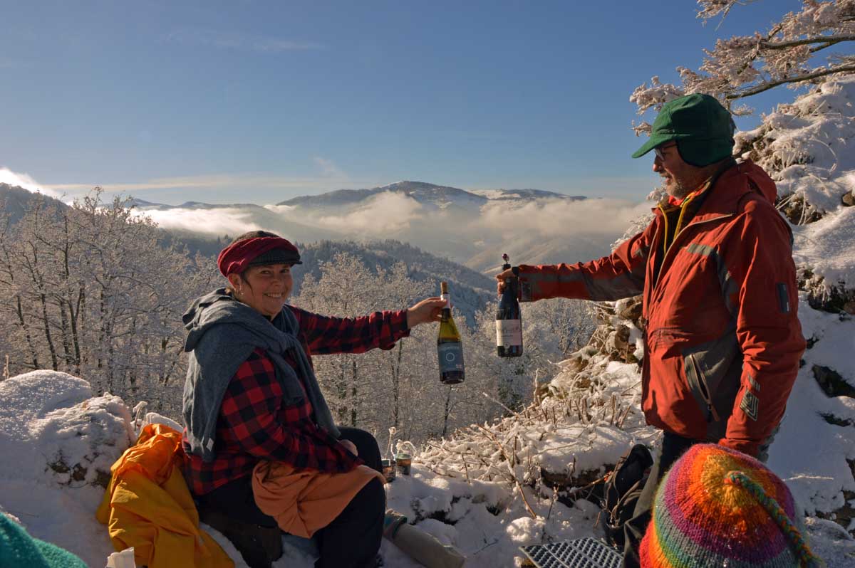C’est au château du Schrankenfels, enfin château je m’entends, une sorte de ruine qui serait encore plus ruinée que les autres, qu’enfin est venu le moment que j’attendais : l’ouverture des bouteilles de pinard. Même sans bise glaciale, ça faisait quand même du bien de se réchauffer. Juste avant le café. Et franchement, une telle salle à manger, c’est pas tous les jours. Pas compliqué : on était scotchés au décor avec toute la crête devant nous.