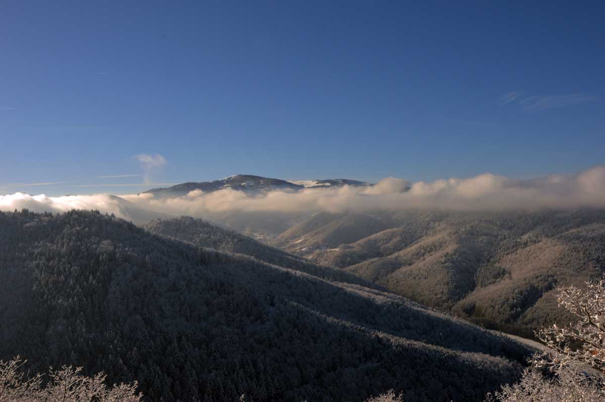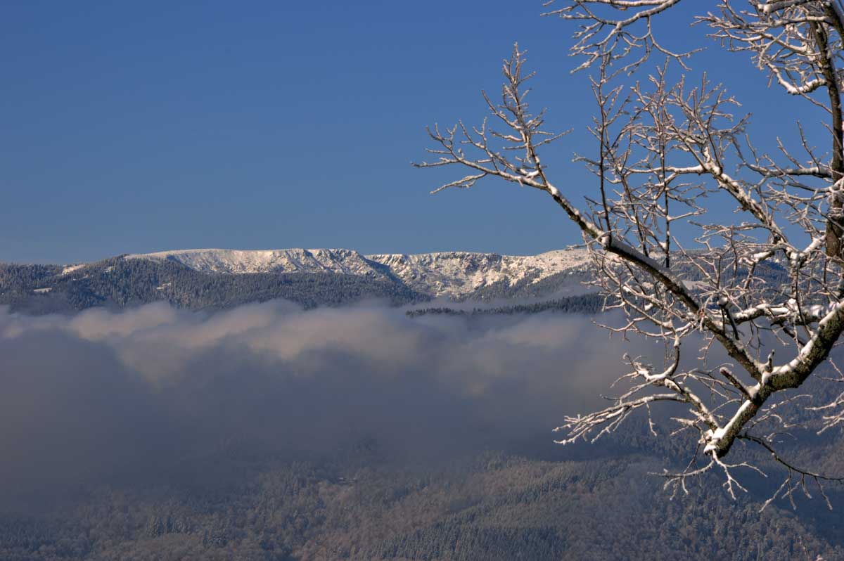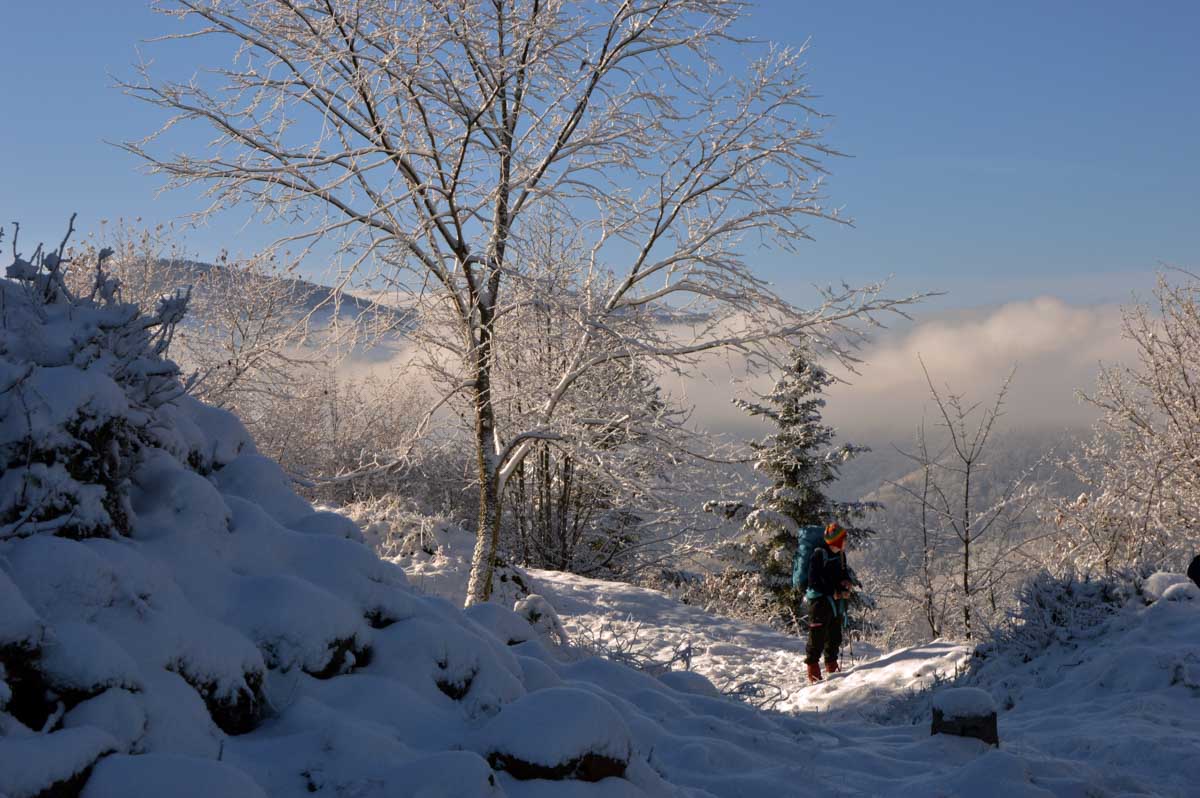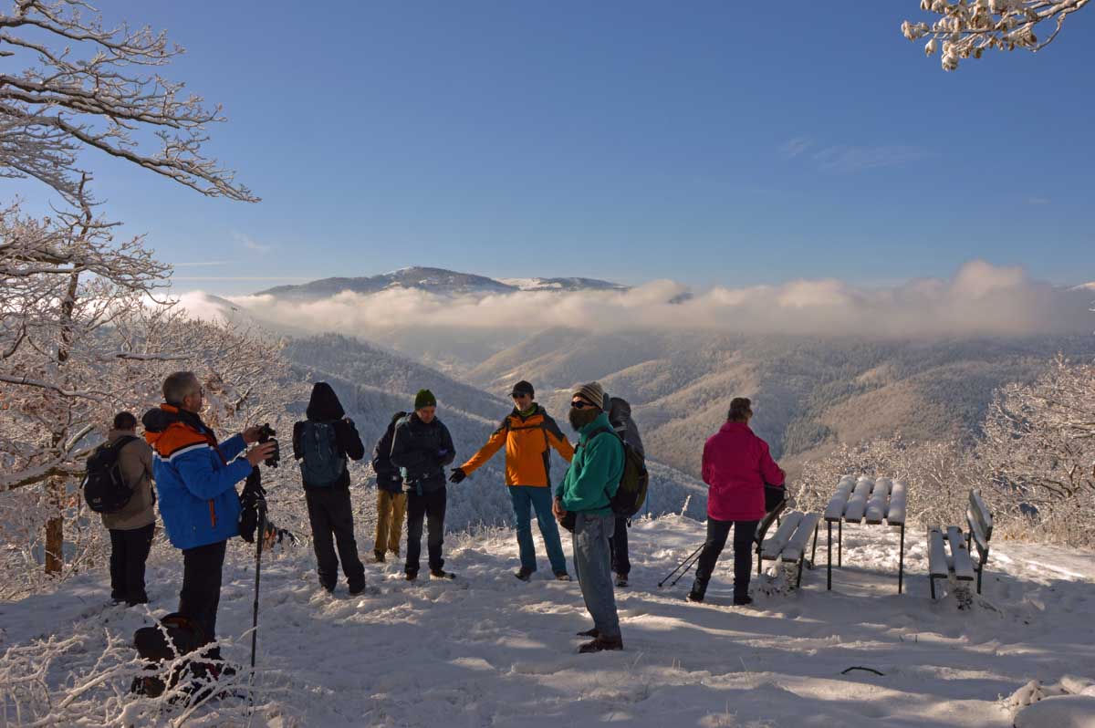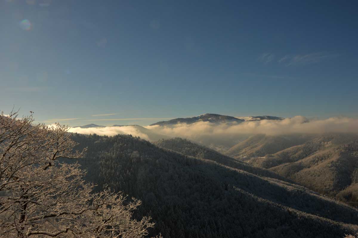 Donc, moi je dis que ça caillait mais la vache, ce que c’était beau ! Ciel bleu, arbres blancs, randonneurs colorés, un panorama à couper le souffle (enfin moi la montée me l’avait déjà coupé, remarque), vue sur le Grand et le Petit Ballon, sur la vallée de Wasserbourg, le grand luxe, quoi !