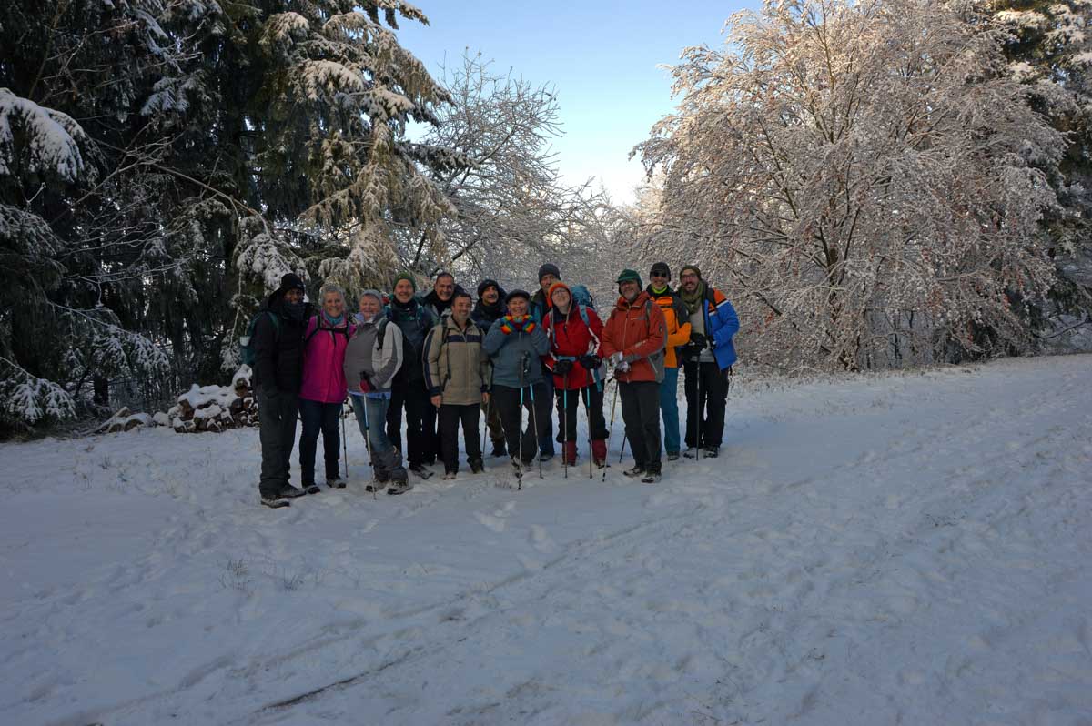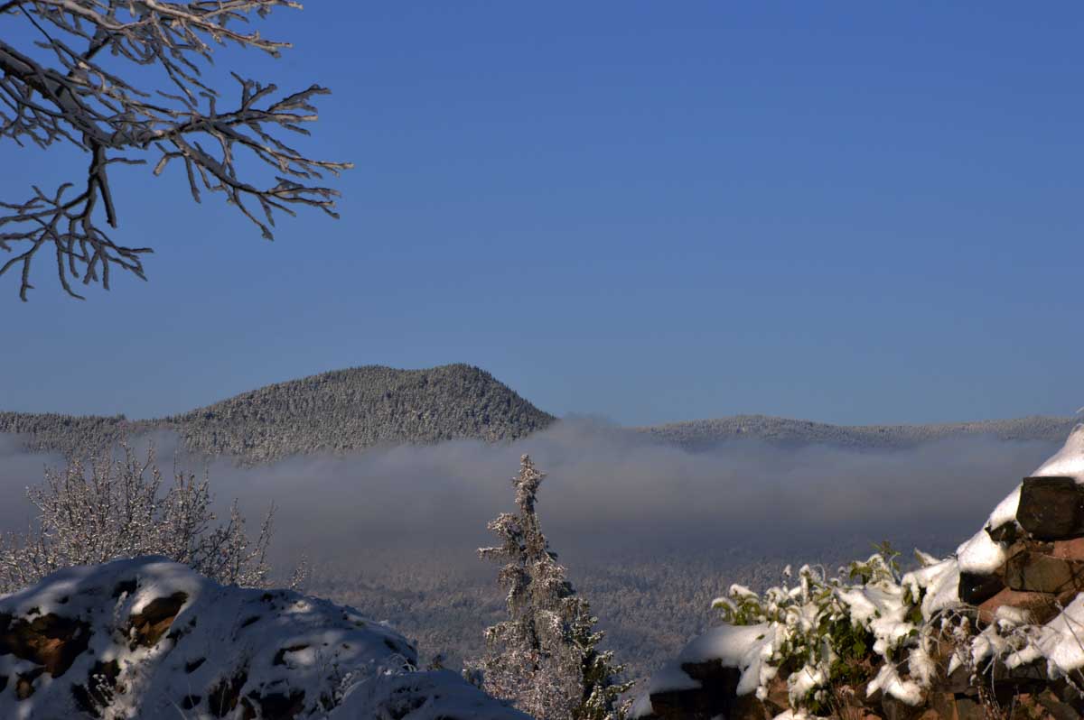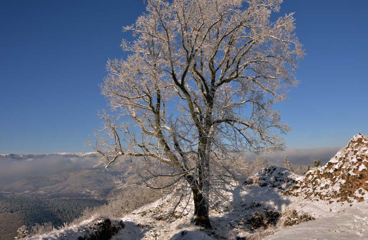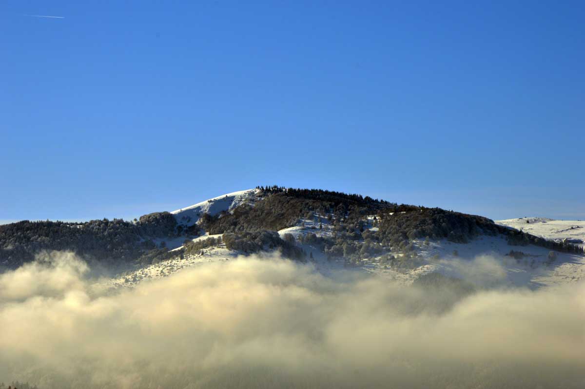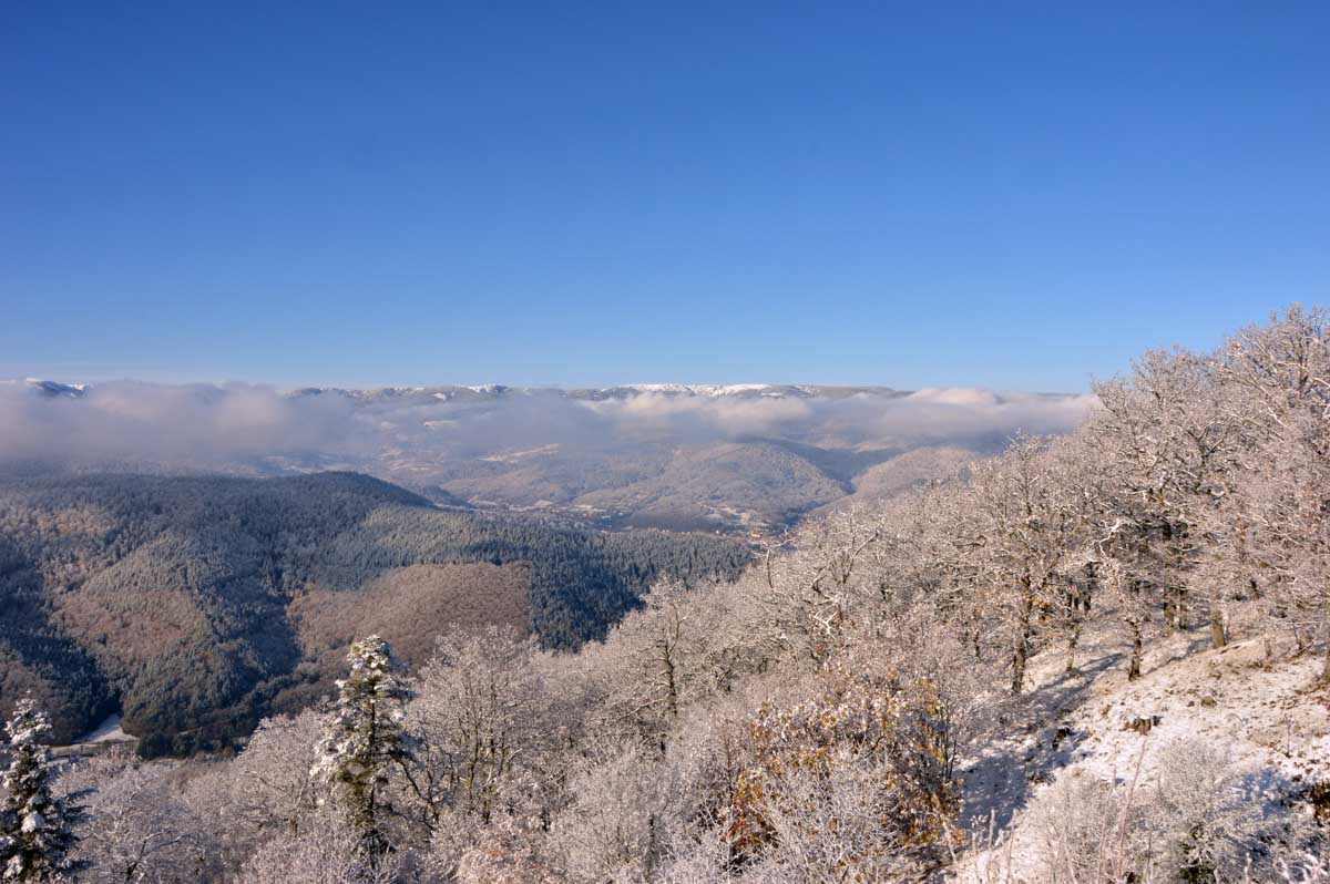 Donc, moi je dis que ça caillait mais la vache, ce que c’était beau ! Ciel bleu, arbres blancs, randonneurs colorés, un panorama à couper le souffle (enfin moi la montée me l’avait déjà coupé, remarque), vue sur le Grand et le Petit Ballon, sur la vallée de Wasserbourg, le grand luxe, quoi !