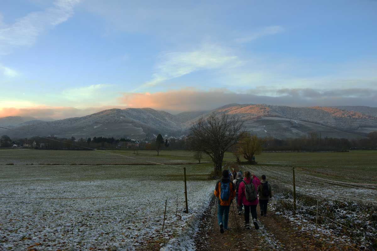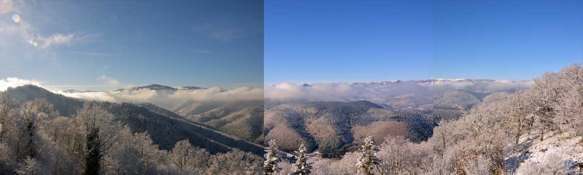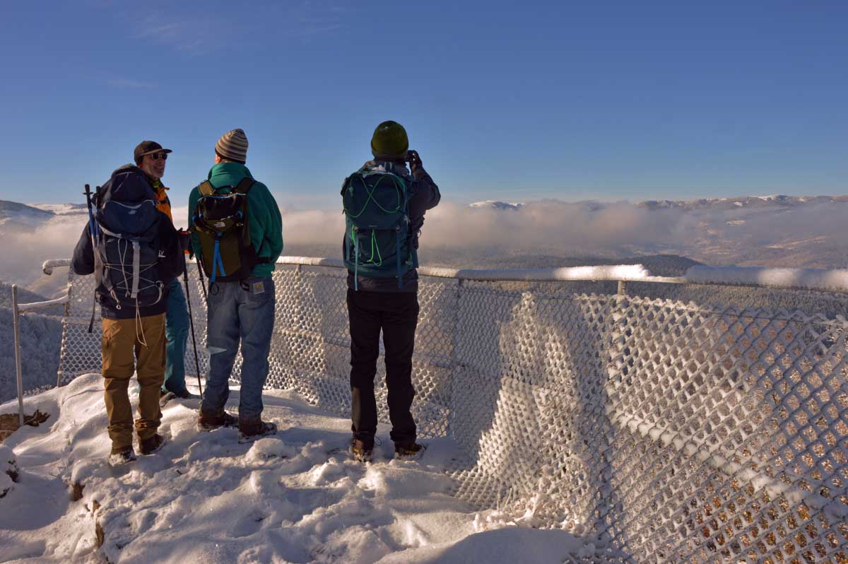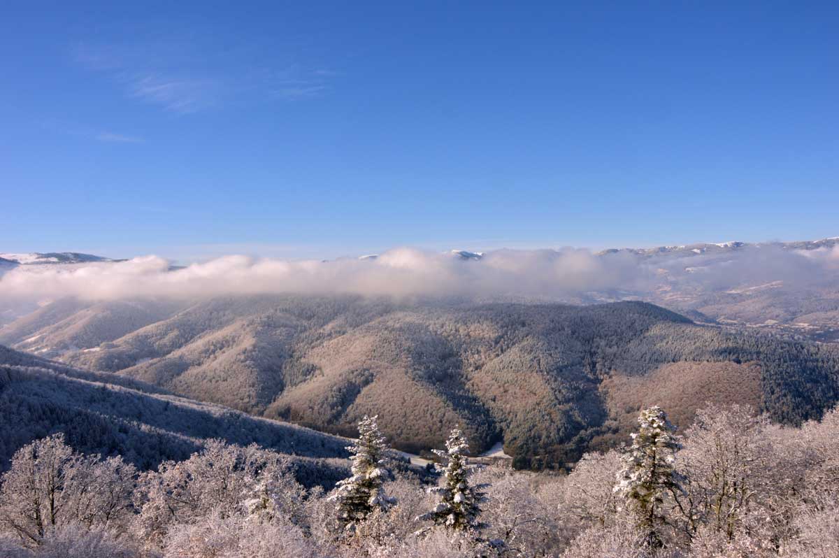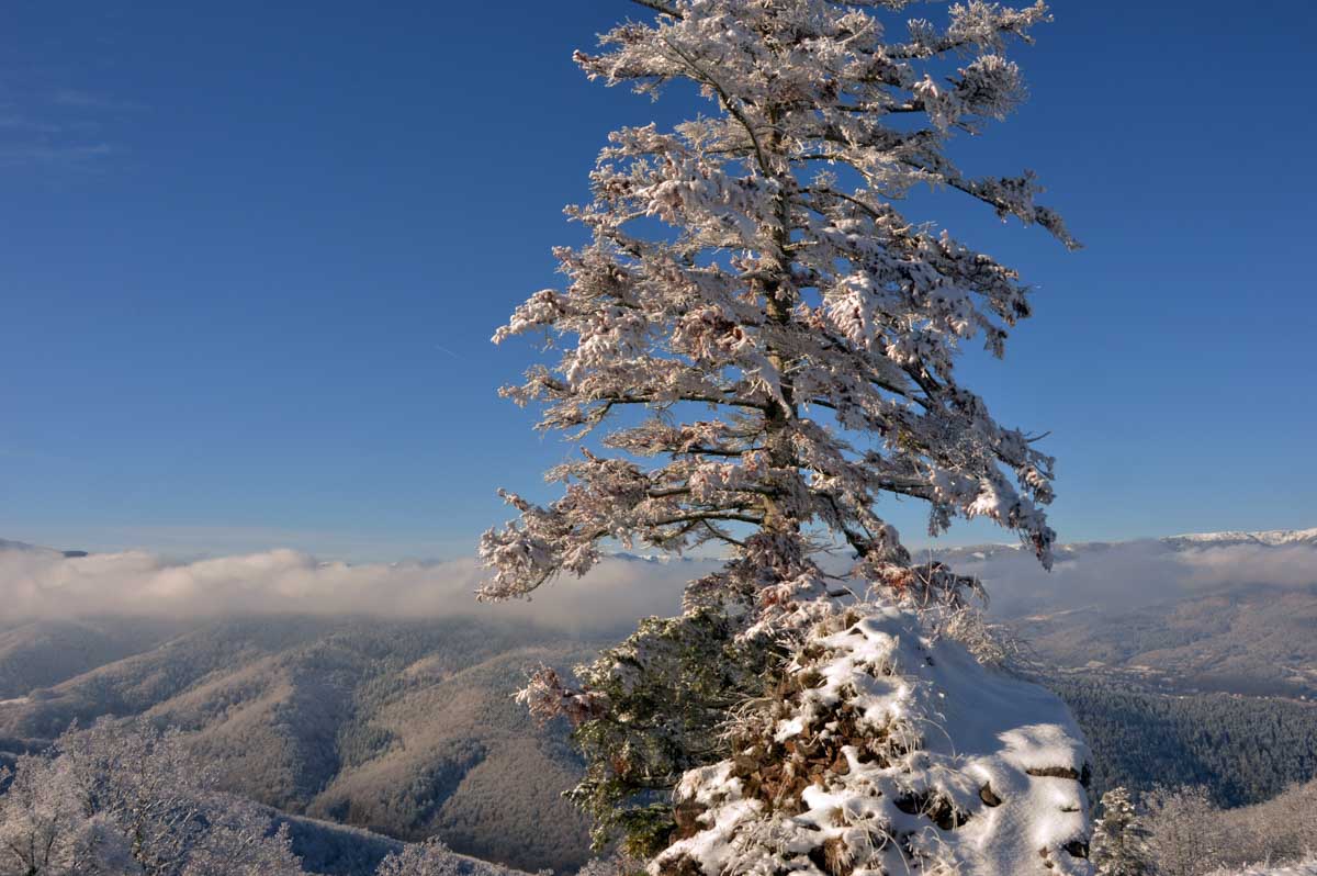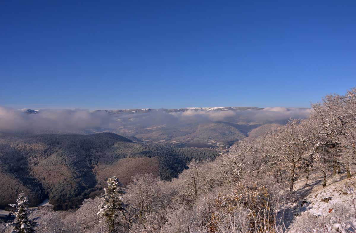 Donc, moi je dis que ça caillait mais la vache, ce que c’était beau ! Ciel bleu, arbres blancs, randonneurs colorés, un panorama à couper le souffle (enfin moi la montée me l’avait déjà coupé, remarque), vue sur le Grand et le Petit Ballon, sur la vallée de Wasserbourg, le grand luxe, quoi !