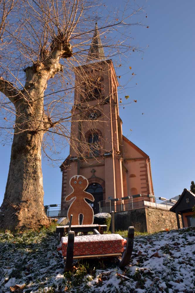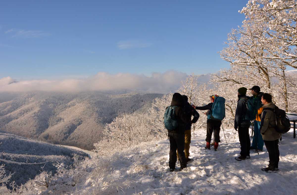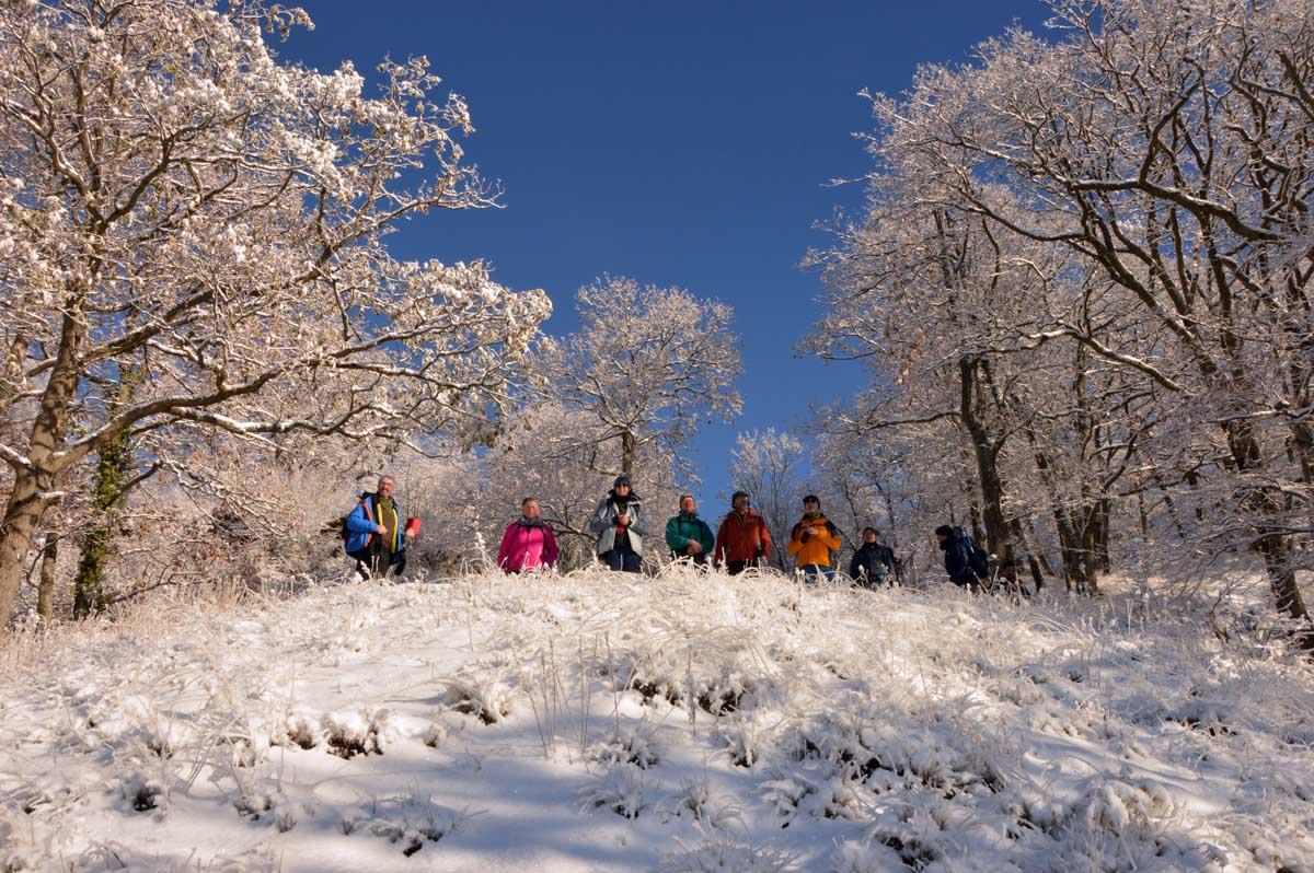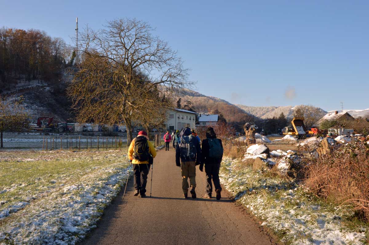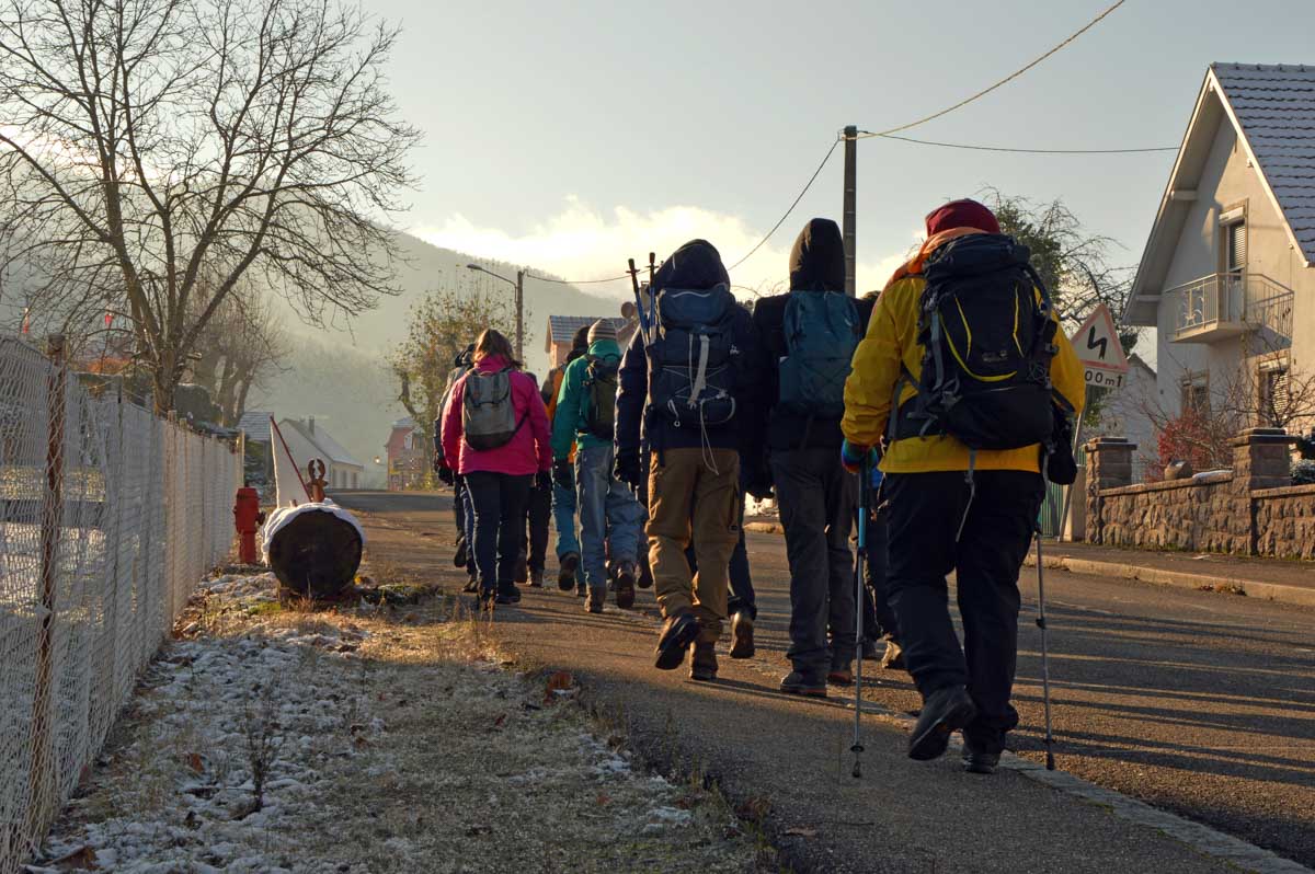Donc, moi je dis que ça caillait mais la vache, ce que c’était beau ! Ciel bleu, arbres blancs, randonneurs colorés, un panorama à couper le souffle (enfin moi la montée me l’avait déjà coupé, remarque), vue sur le Grand et le Petit Ballon, sur la vallée de Wasserbourg, le grand luxe, quoi !