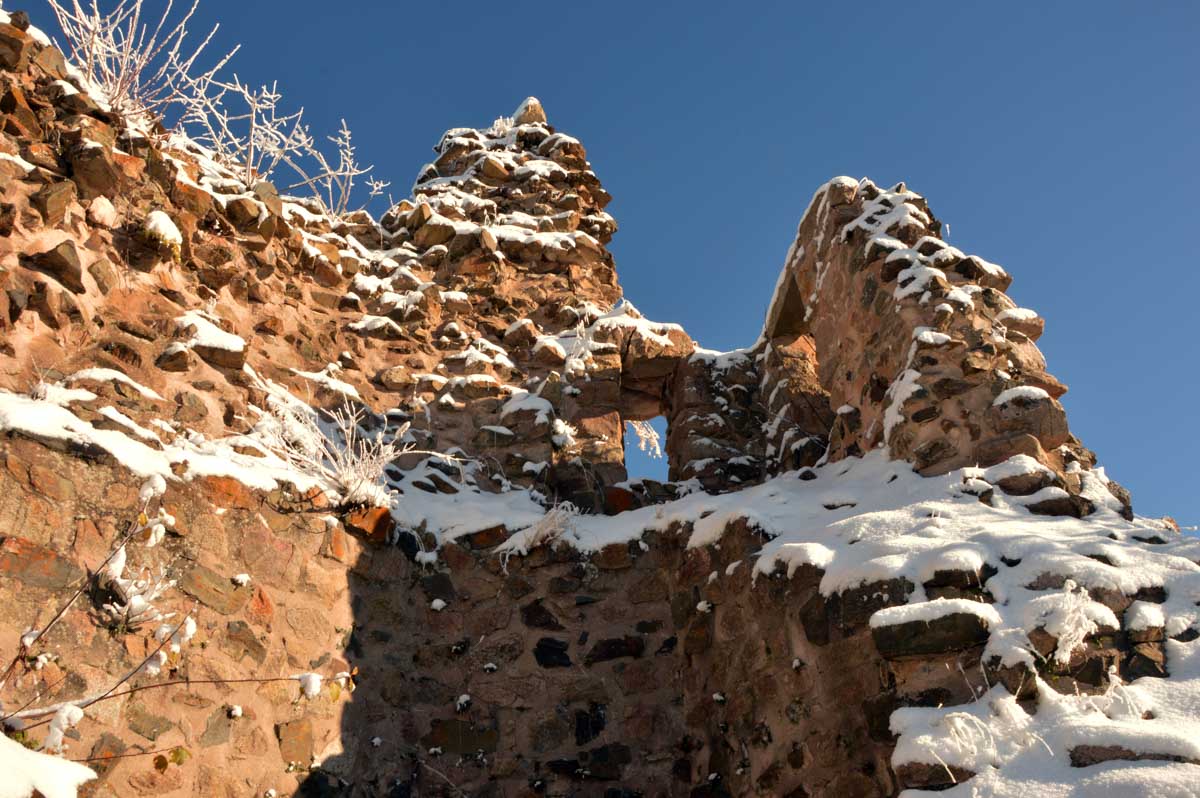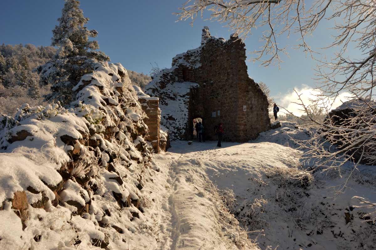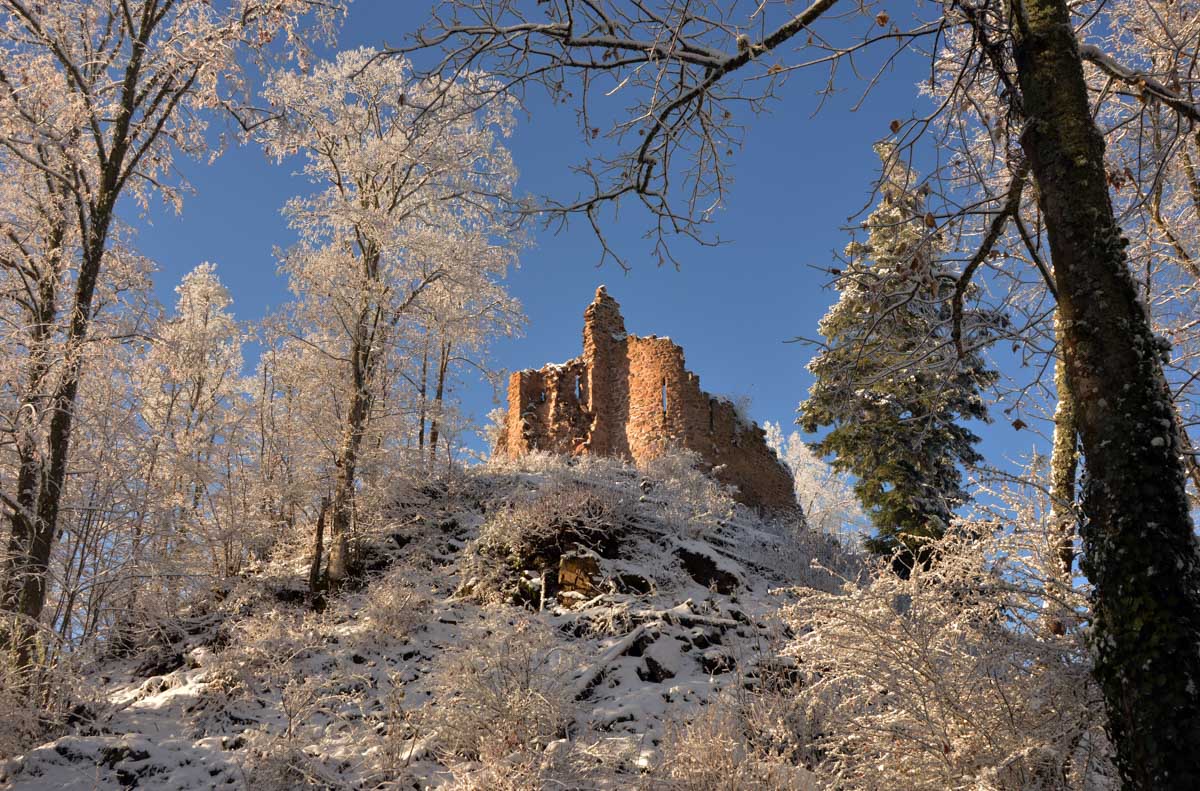 Bon alors OK je précise : quand je dis gober la chose, je parle bien sûr de l’histoire, du côté conte de fées. Ça va là, c’est plus clair ? Toujours à me reprendre avec tes pensées mal placées, franchement… Et aujourd’hui à mon palmarès, deux ruines qu’on n’avait jamais visitées. Le Schrankenfels donc, dont le donjon s’est écroulé en 1967. Puis, le Haneck ayant carrément disparu, on l’a remplacé par le Haut-Hattmatt qui s’est écroulé au début des années 2000. On a tout de même vu encore un bout de mur !