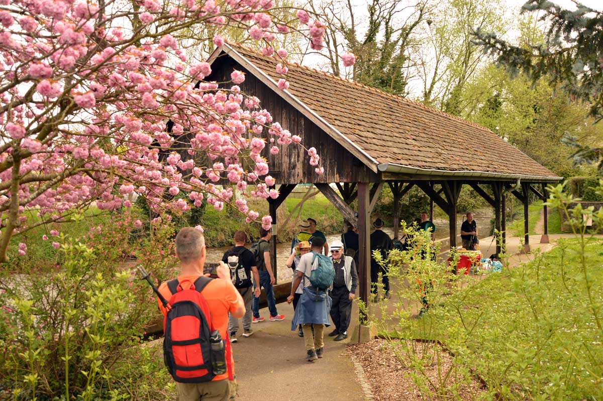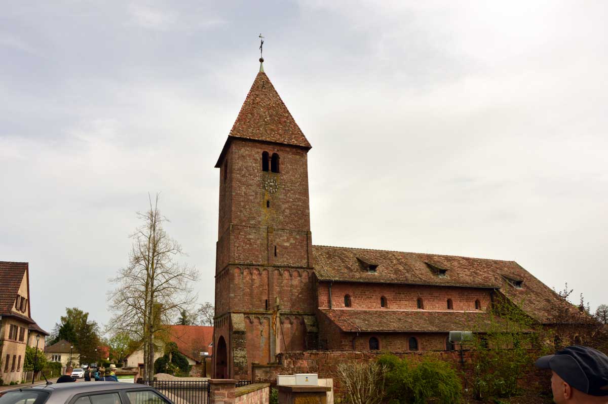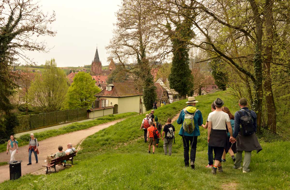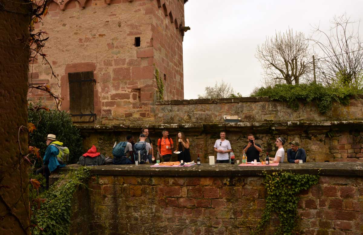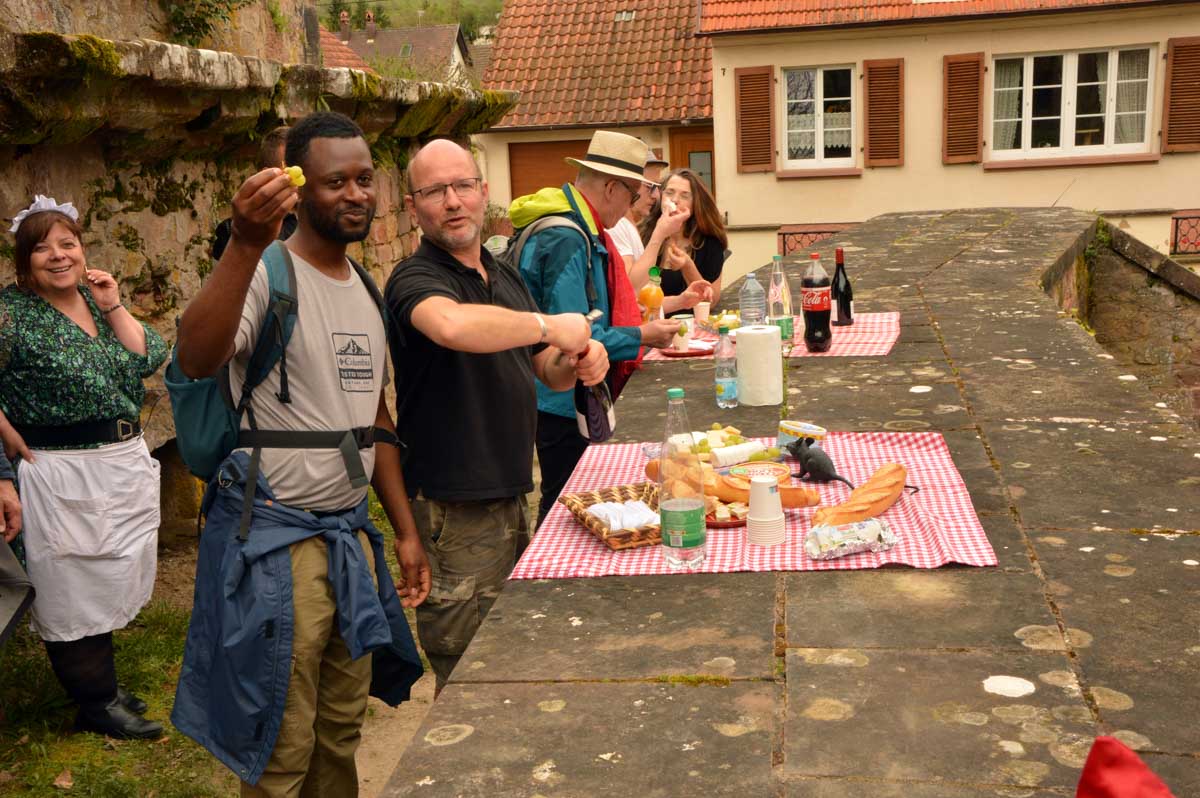 Puis nous descendîmes à travers champs vers Altenstadt, où nous admîrames l’église romane Saint-Ulrich du 12ème siècle ; nous restâmes sans voix dans la nef en pierre brute et le buffet de l’orgue, puis nous nous régalâmes d’un autre buffet, proposé celui-ci par la Princesse et le Prince à l’ancien lavoir. L’entrée était servie sur un air de Vivaldi ! Sans rames nous nous mîrames dans la Lauter, pour pas un diram ! C’est là que nous apprîmes que les agapes n’étaient point terminées puisque… Si, si, c’est un nom féminin donc je conjugue au féminin. Commence pas, hein, on vient juste de terminer le hors d’œuvre. Parce que oui, à peine remise en selle, enfin en marche approximative plutôt, voilà que je reconnais la Soupe aux Choux. Non pas le menu, encore moins la symphonie gazeuse caractérisant le film, mais sa musique, genre bourrée auvergnate après laquelle on allait d’ailleurs se bourrer de Spätzle, de ragoût et de vin, sans pour autant finir bourrés. Quoi que… Oui ben relis, faut suivre, mon canard ! Certains se sont aventurés dans une sieste, d’autres ont courageusement repris une portion et là… là il a fallu se lever. Je me souvenais même pas que j’étais assise, c’est te dire, alors j’ai commencé à avancer avec la chaise collée à l’arrière-train, pleine d’entrain et en train de vider mon verre de rouge. Restait sept kilomètres à parcourir…