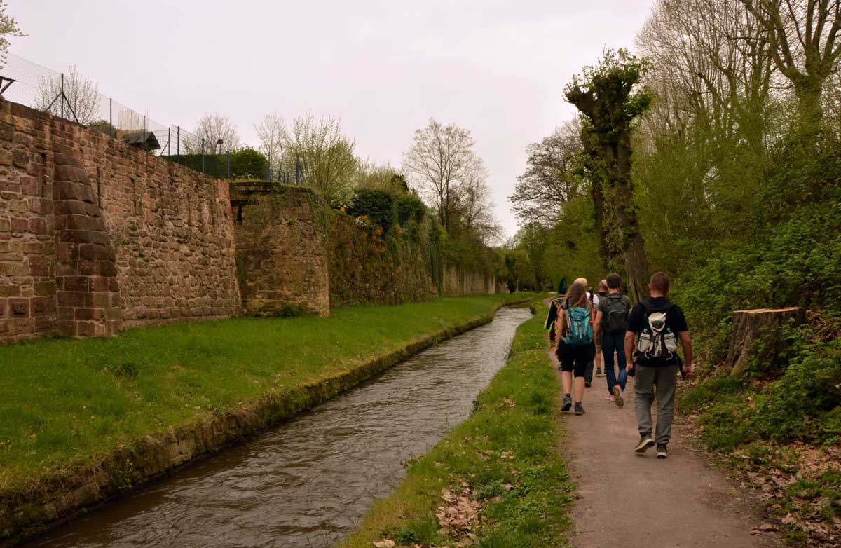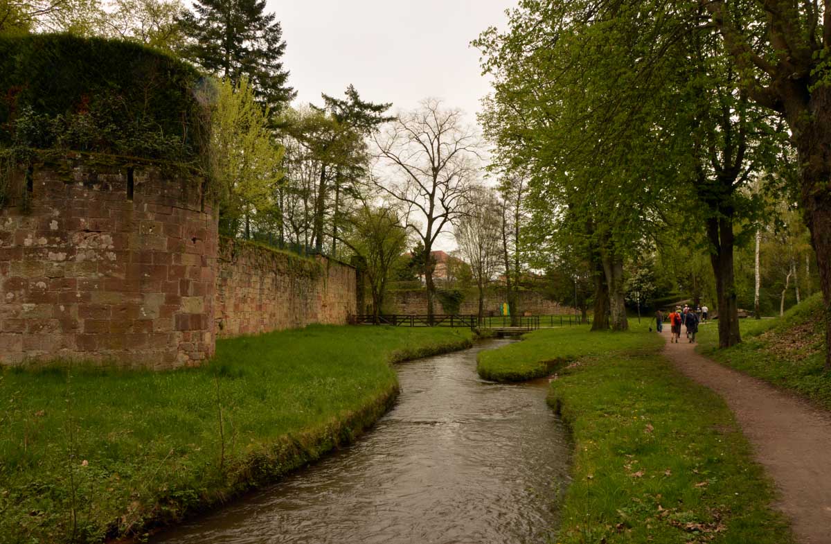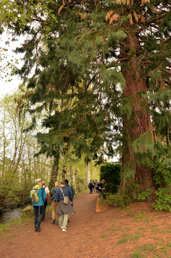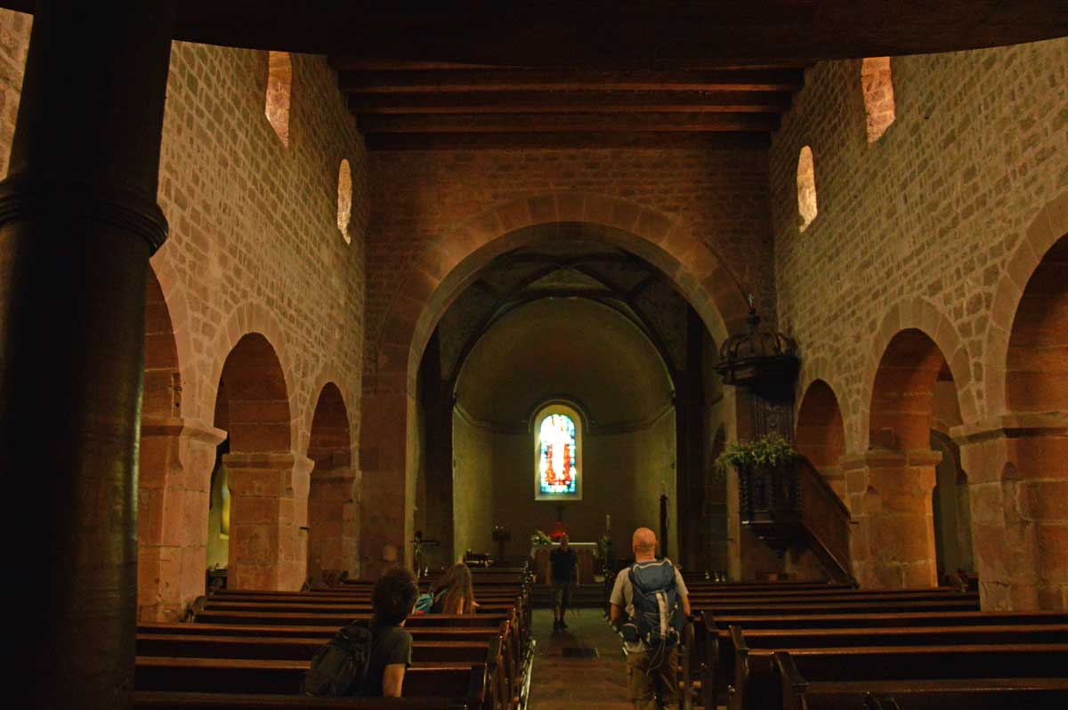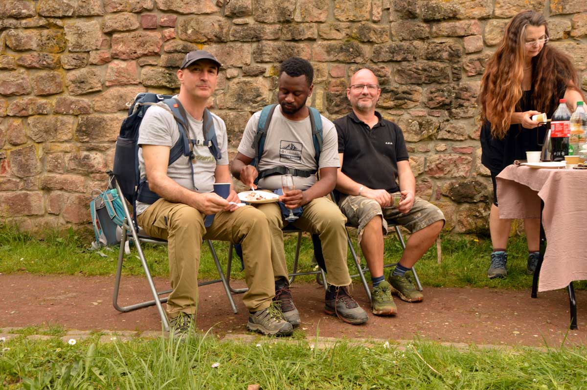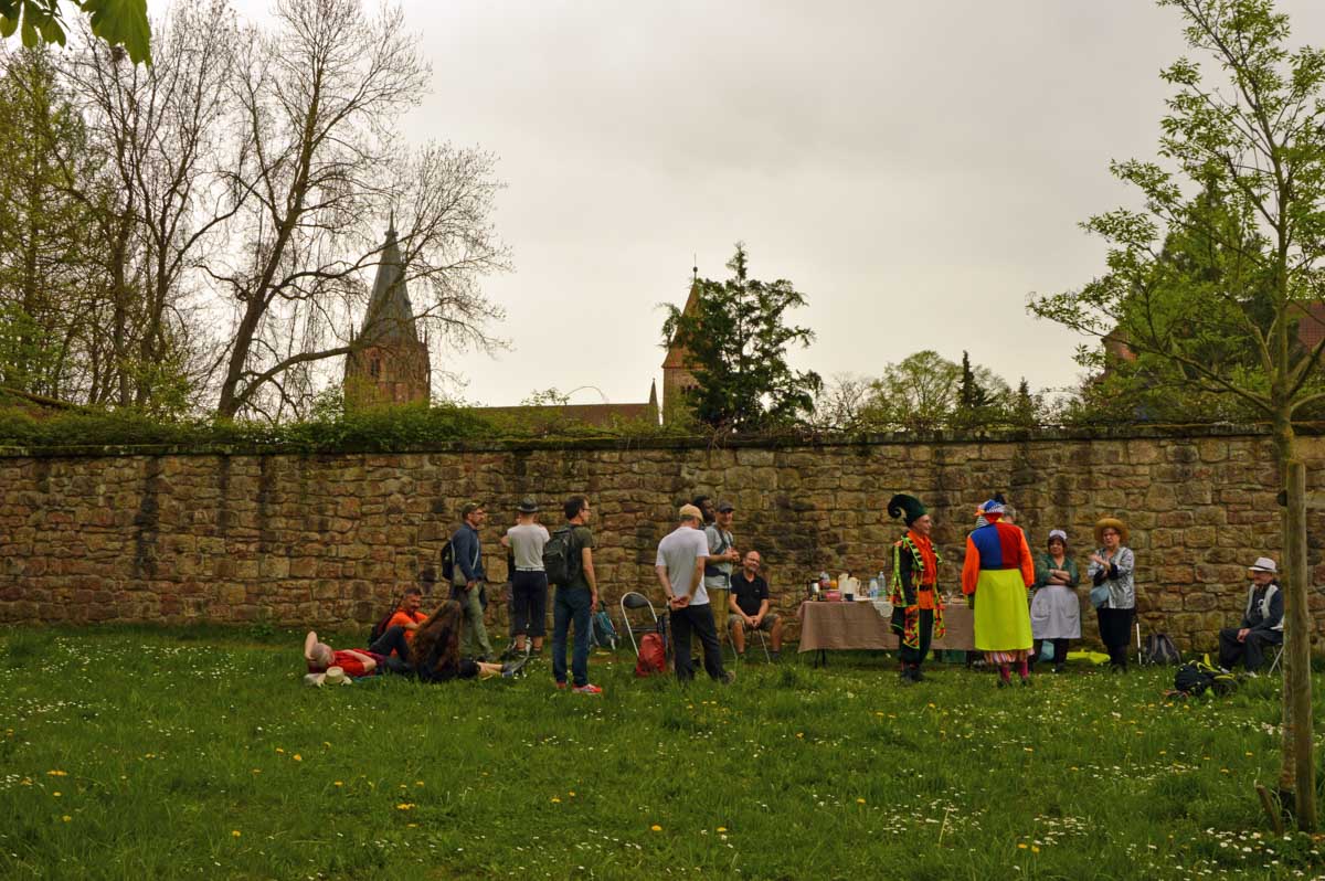 Puis nous descendîmes à travers champs vers Altenstadt, où nous admîrames l’église romane Saint-Ulrich du 12ème siècle ; nous restâmes sans voix dans la nef en pierre brute et le buffet de l’orgue, puis nous nous régalâmes d’un autre buffet, proposé celui-ci par la Princesse et le Prince à l’ancien lavoir. L’entrée était servie sur un air de Vivaldi ! Sans rames nous nous mîrames dans la Lauter, pour pas un diram ! C’est là que nous apprîmes que les agapes n’étaient point terminées puisque… Si, si, c’est un nom féminin donc je conjugue au féminin. Commence pas, hein, on vient juste de terminer le hors d’œuvre. Parce que oui, à peine remise en selle, enfin en marche approximative plutôt, voilà que je reconnais la Soupe aux Choux. Non pas le menu, encore moins la symphonie gazeuse caractérisant le film, mais sa musique, genre bourrée auvergnate après laquelle on allait d’ailleurs se bourrer de Spätzle, de ragoût et de vin, sans pour autant finir bourrés. Quoi que… Oui ben relis, faut suivre, mon canard ! Certains se sont aventurés dans une sieste, d’autres ont courageusement repris une portion et là… là il a fallu se lever. Je me souvenais même pas que j’étais assise, c’est te dire, alors j’ai commencé à avancer avec la chaise collée à l’arrière-train, pleine d’entrain et en train de vider mon verre de rouge. Restait sept kilomètres à parcourir…