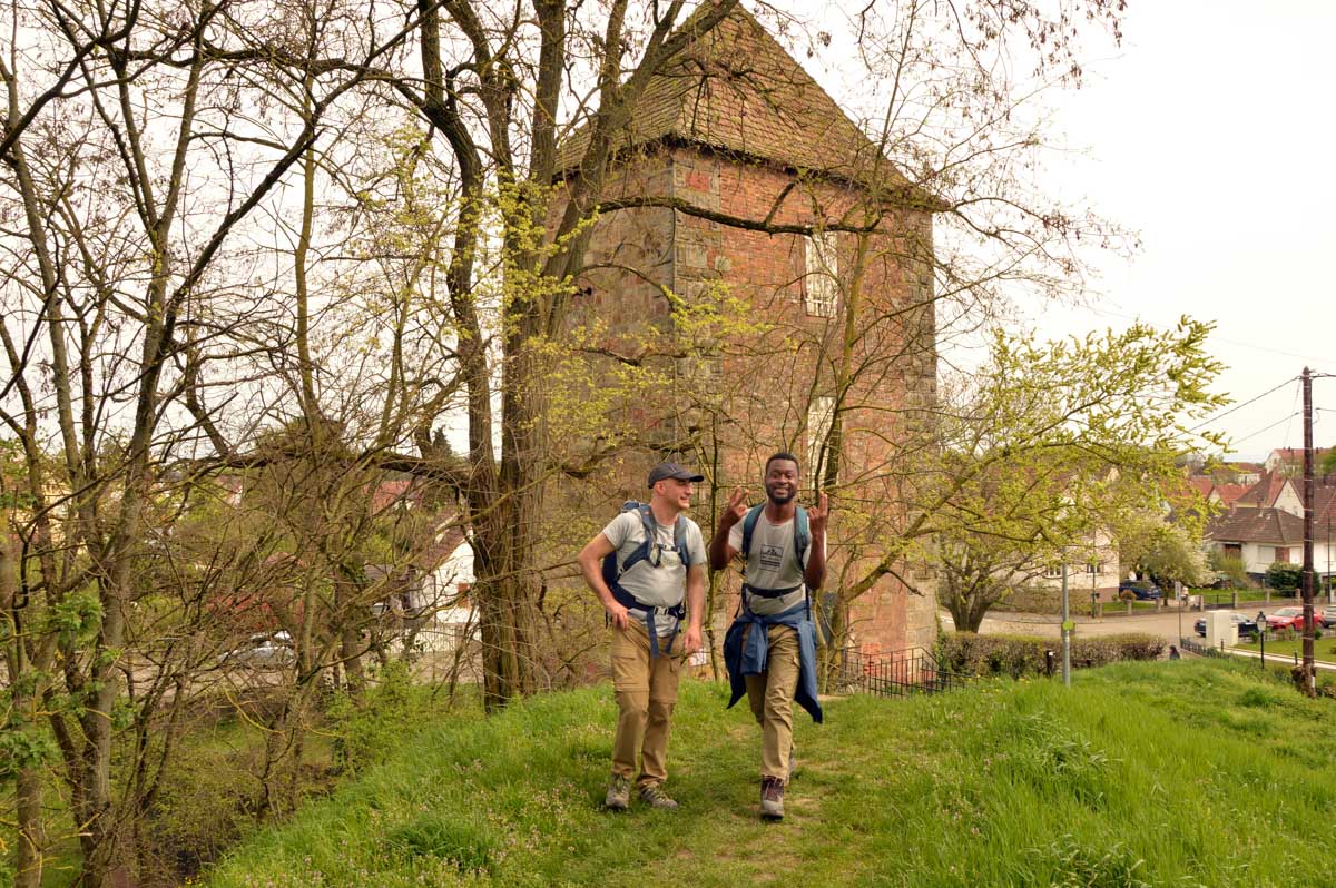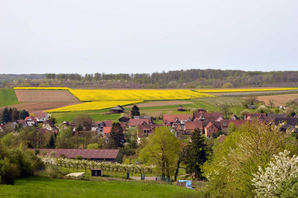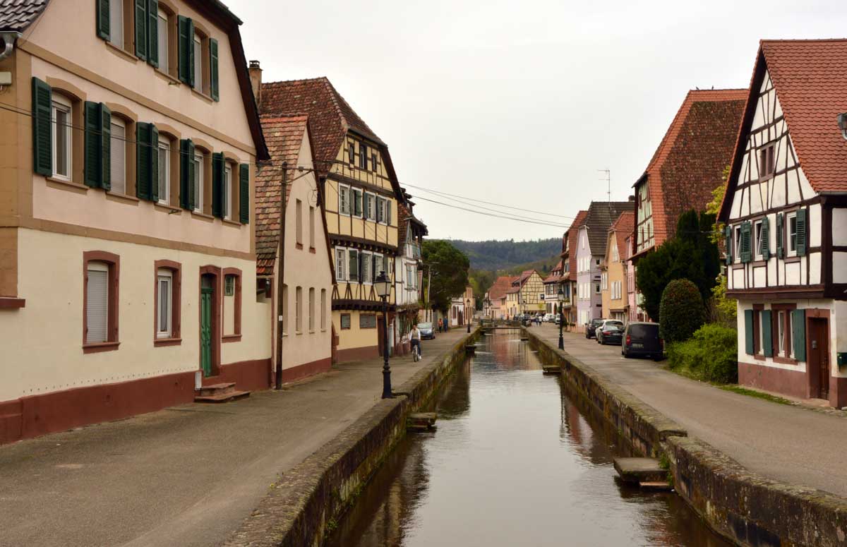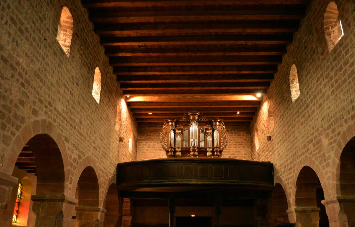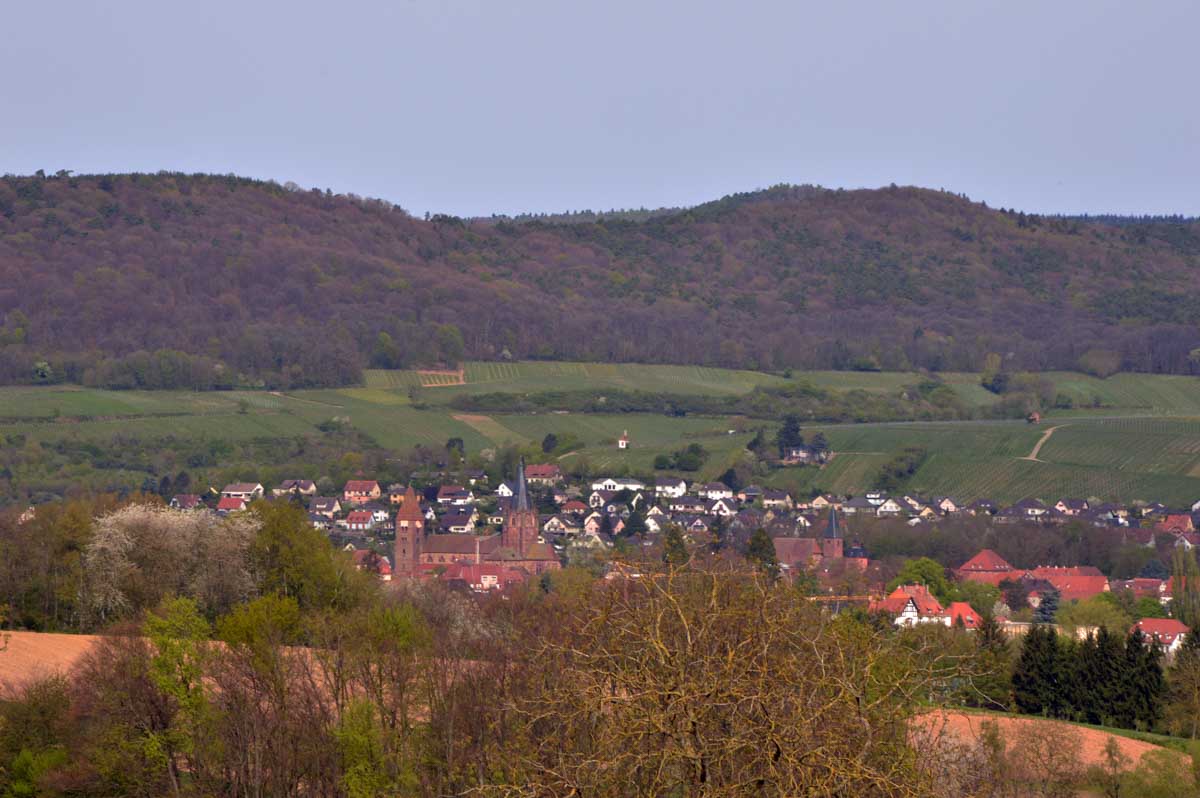 Puis nous descendîmes à travers champs vers Altenstadt, où nous admîrames l’église romane Saint-Ulrich du 12ème siècle ; nous restâmes sans voix dans la nef en pierre brute et le buffet de l’orgue, puis nous nous régalâmes d’un autre buffet, proposé celui-ci par la Princesse et le Prince à l’ancien lavoir. L’entrée était servie sur un air de Vivaldi ! Sans rames nous nous mîrames dans la Lauter, pour pas un diram ! C’est là que nous apprîmes que les agapes n’étaient point terminées puisque… Si, si, c’est un nom féminin donc je conjugue au féminin. Commence pas, hein, on vient juste de terminer le hors d’œuvre. Parce que oui, à peine remise en selle, enfin en marche approximative plutôt, voilà que je reconnais la Soupe aux Choux. Non pas le menu, encore moins la symphonie gazeuse caractérisant le film, mais sa musique, genre bourrée auvergnate après laquelle on allait d’ailleurs se bourrer de Spätzle, de ragoût et de vin, sans pour autant finir bourrés. Quoi que… Oui ben relis, faut suivre, mon canard ! Certains se sont aventurés dans une sieste, d’autres ont courageusement repris une portion et là… là il a fallu se lever. Je me souvenais même pas que j’étais assise, c’est te dire, alors j’ai commencé à avancer avec la chaise collée à l’arrière-train, pleine d’entrain et en train de vider mon verre de rouge. Restait sept kilomètres à parcourir…