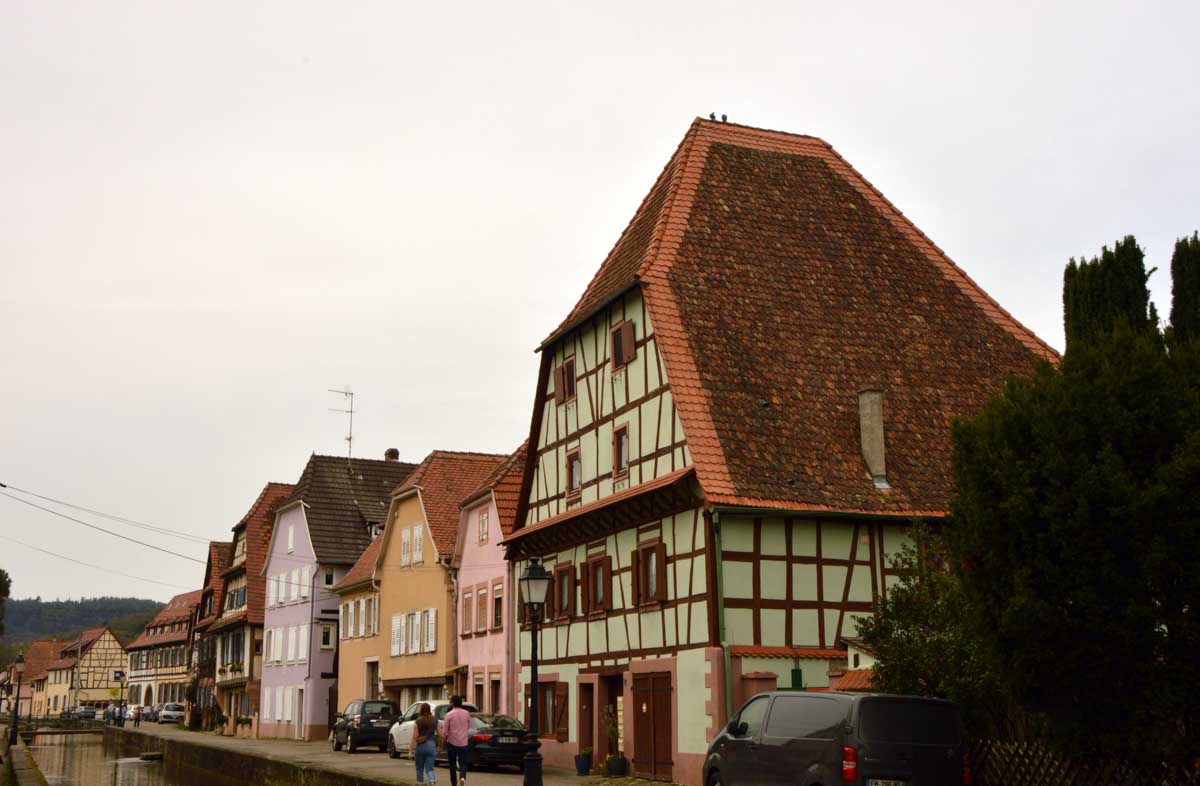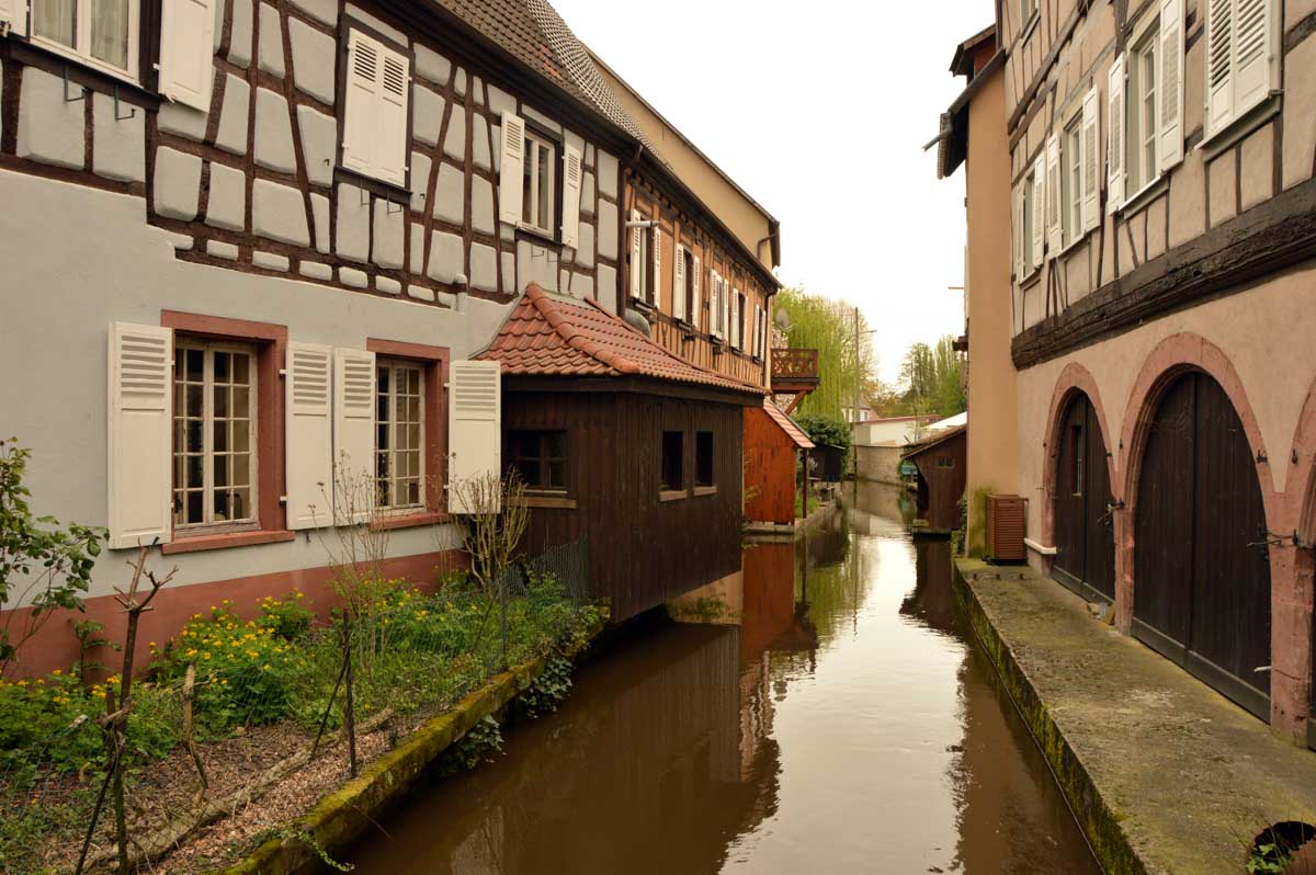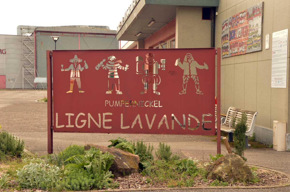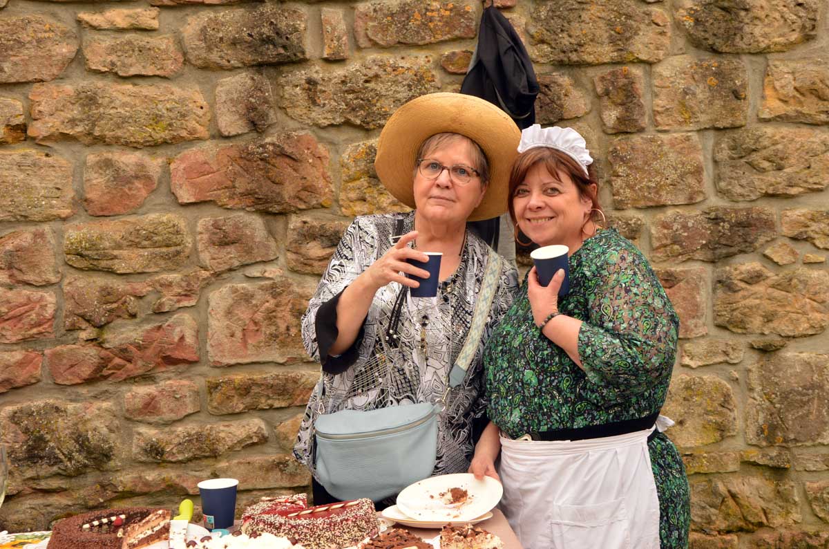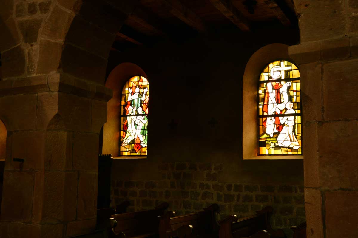 Puis nous descendîmes à travers champs vers Altenstadt, où nous admîrames l’église romane Saint-Ulrich du 12ème siècle ; nous restâmes sans voix dans la nef en pierre brute et le buffet de l’orgue, puis nous nous régalâmes d’un autre buffet, proposé celui-ci par la Princesse et le Prince à l’ancien lavoir. L’entrée était servie sur un air de Vivaldi ! Sans rames nous nous mîrames dans la Lauter, pour pas un diram ! C’est là que nous apprîmes que les agapes n’étaient point terminées puisque… Si, si, c’est un nom féminin donc je conjugue au féminin. Commence pas, hein, on vient juste de terminer le hors d’œuvre. Parce que oui, à peine remise en selle, enfin en marche approximative plutôt, voilà que je reconnais la Soupe aux Choux. Non pas le menu, encore moins la symphonie gazeuse caractérisant le film, mais sa musique, genre bourrée auvergnate après laquelle on allait d’ailleurs se bourrer de Spätzle, de ragoût et de vin, sans pour autant finir bourrés. Quoi que… Oui ben relis, faut suivre, mon canard ! Certains se sont aventurés dans une sieste, d’autres ont courageusement repris une portion et là… là il a fallu se lever. Je me souvenais même pas que j’étais assise, c’est te dire, alors j’ai commencé à avancer avec la chaise collée à l’arrière-train, pleine d’entrain et en train de vider mon verre de rouge. Restait sept kilomètres à parcourir…
