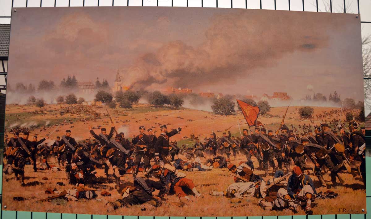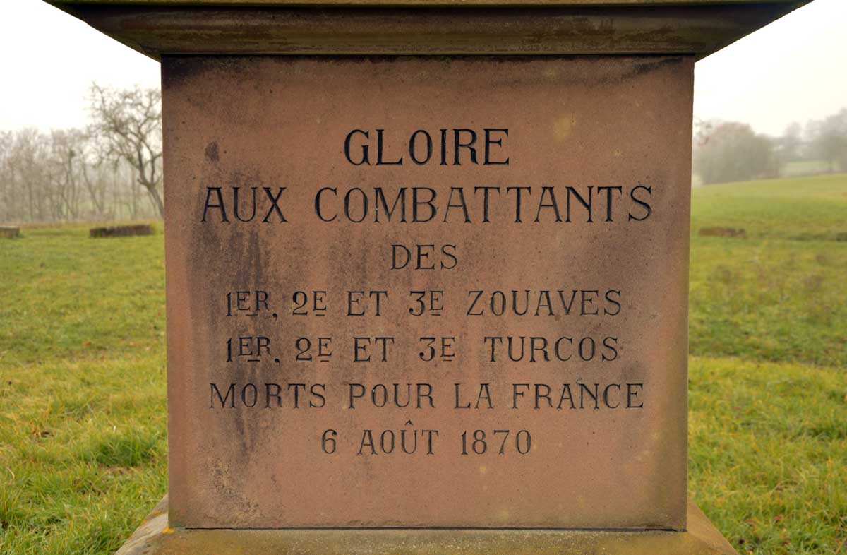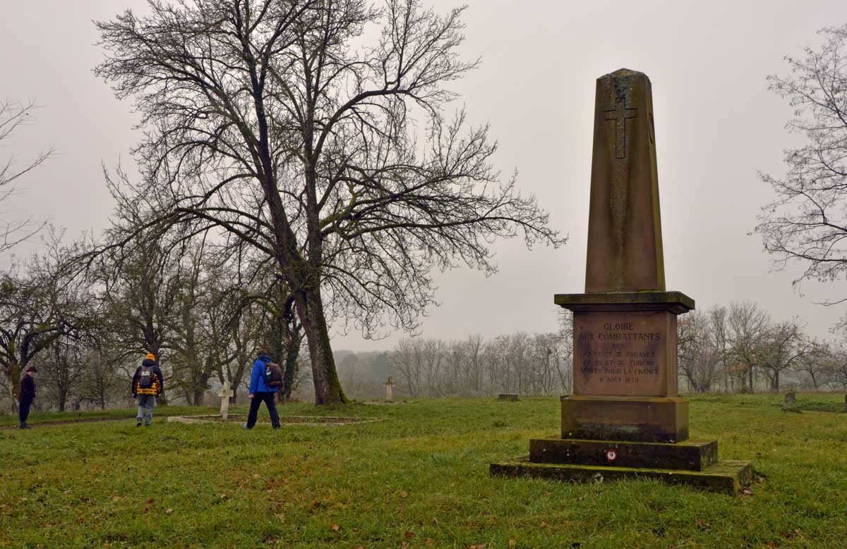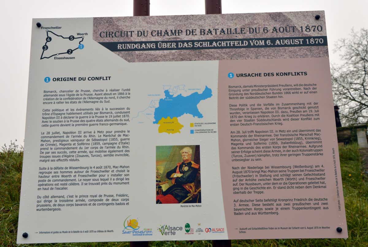 Cent-cinquante ans plus tard, on l’a suivi sur le chemin de mémoire de la bataille de Froeschwiller-Woerth, plus connue sous le nom de bataille de Reichshoffen, où Mac Mahon dut s’incliner devant l’armée prussienne. Et c’est là que… Tu dis ? Pourquoi alors ça s’appelle la bataille de Reichshoffen ? Mais qu’est-ce tu veux que j’en susse, moi ? Encore tombée sur un intellectuel, moi. Et c’est quoi le nom de cette fleur, et pourquoi une vache ça meugle, et c’est qui qui ? Après on me reproche que mes articles sont trop longs mais je suis tout le temps interrompue.