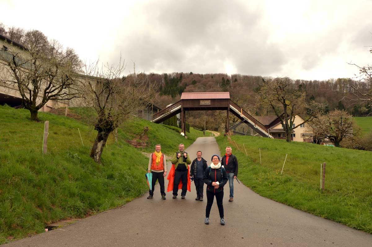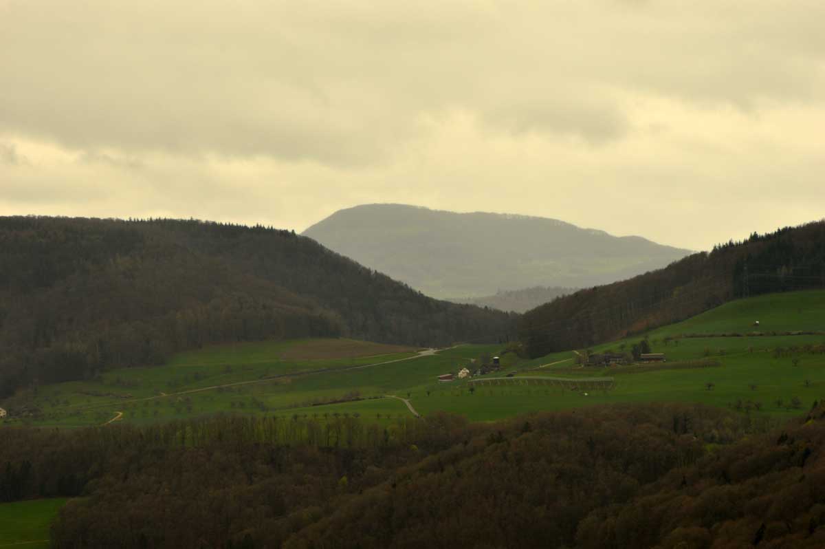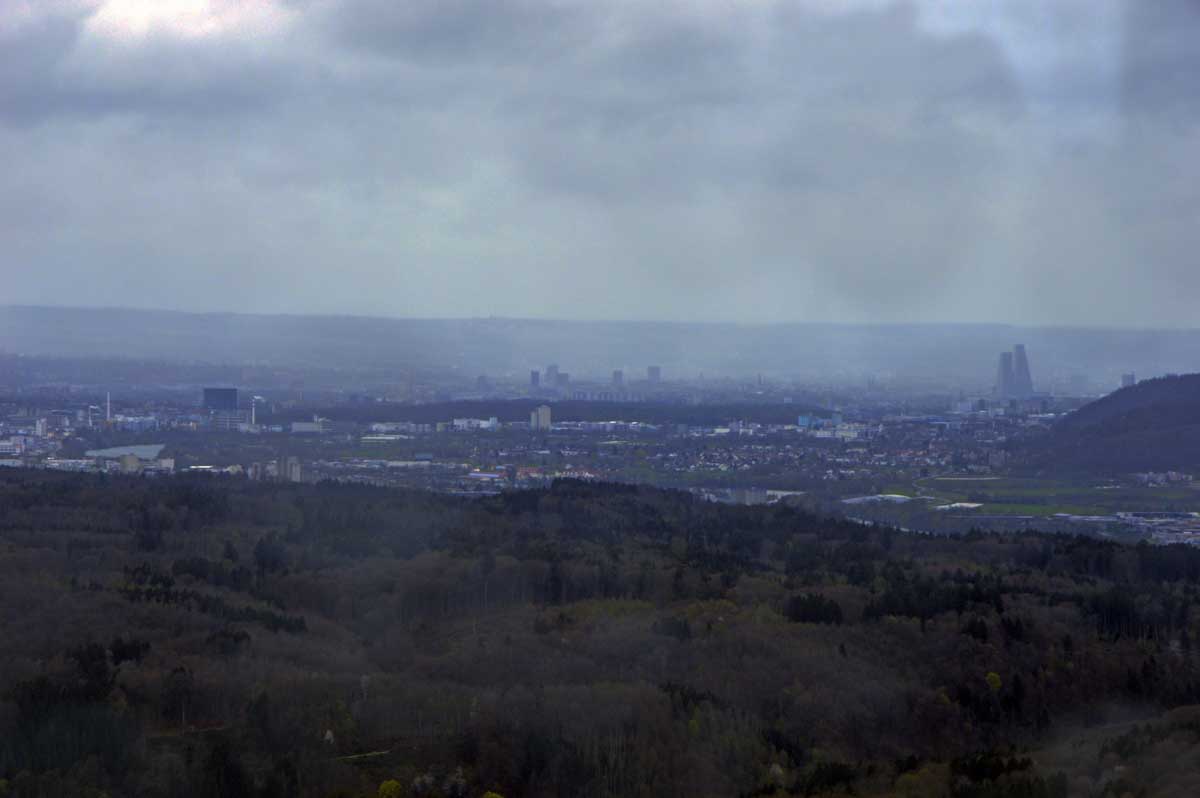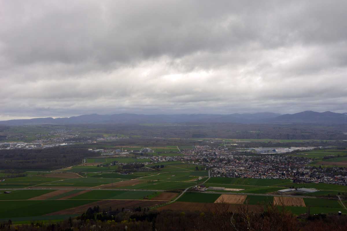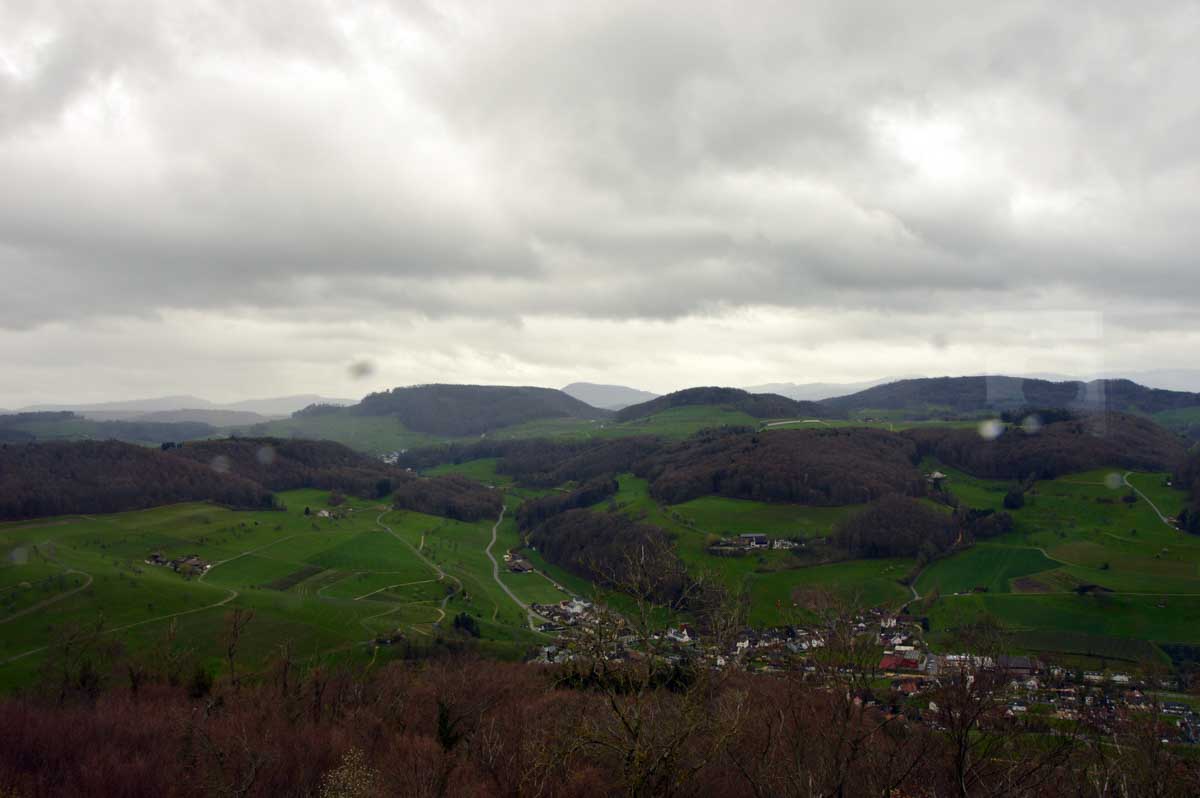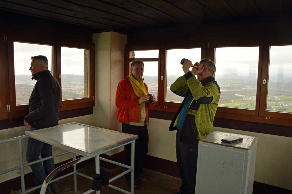 Nous allions apprendre par la suite que cette fois, nous avions commencé par la montée résiduelle dès le départ, pour arriver à la Tour du Sunnenberg et son impressionnant escalier en bois. Avec un vent à décorner les chèvres (foutons la paix aux bœufs pour une fois), nous avons, au travers des gouttes, profité de la vue sur le fameux trou de Bâle, dont la perspective se prolonge par le Haut-Rhin. Ben quoi, ce n’est pas moi qui ai inventé les noms. De l’autre côté dudit trou apparaissait la Forêt-Noire dans laquelle nous allions pénétrer le lendemain. Oui bon, il faut réviser sa géographie !