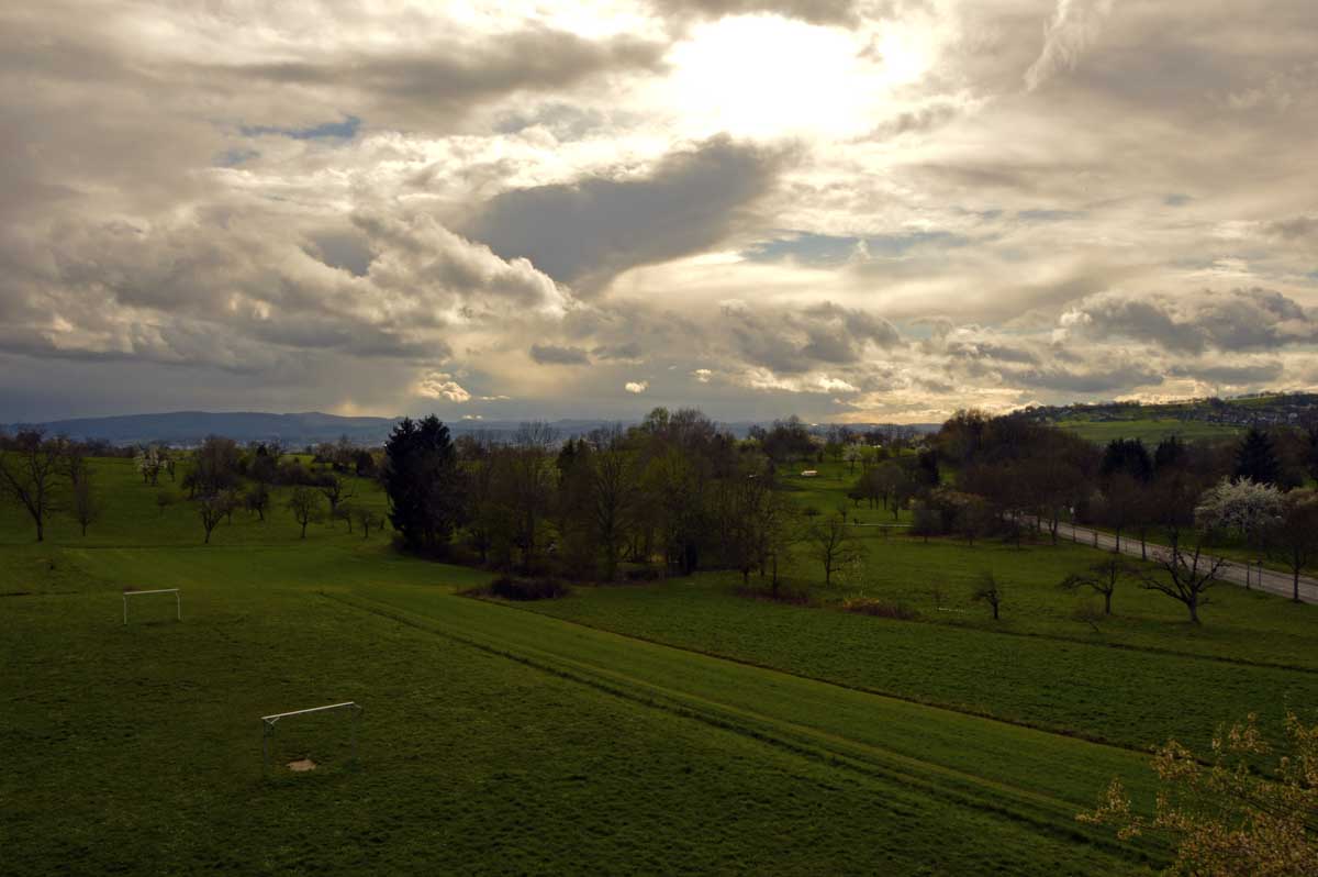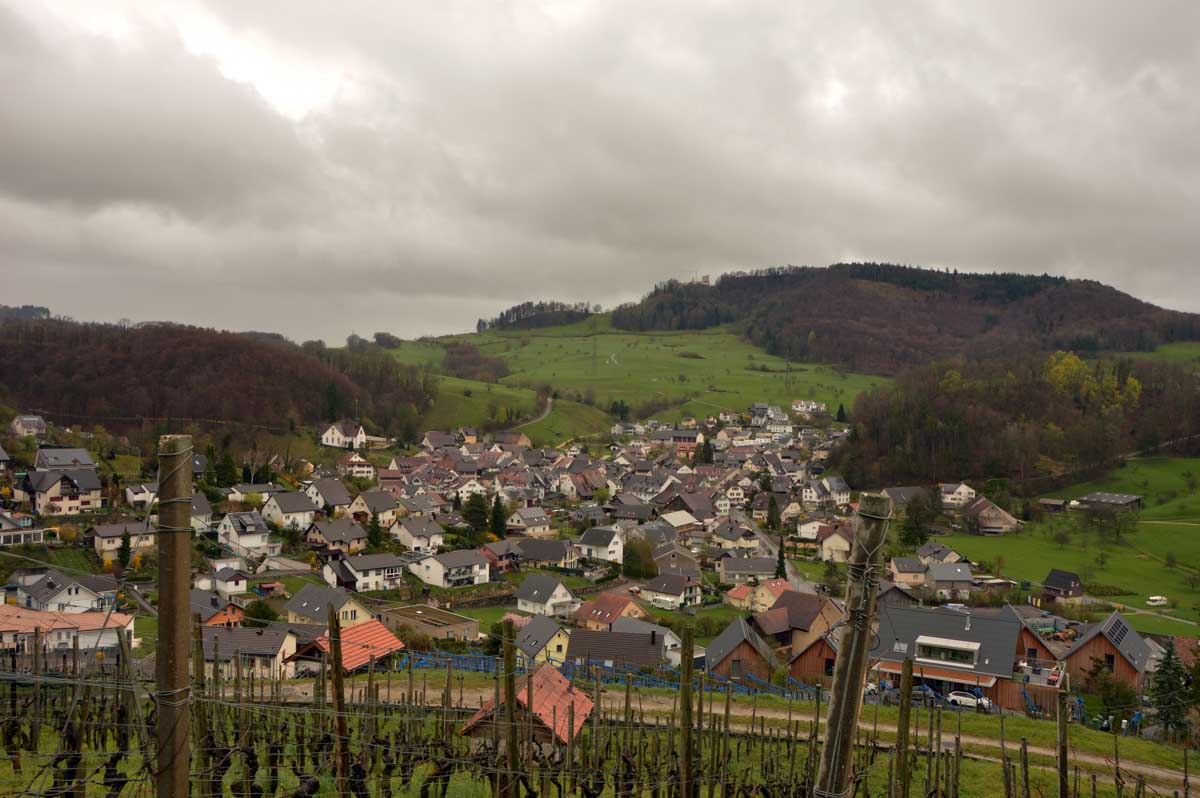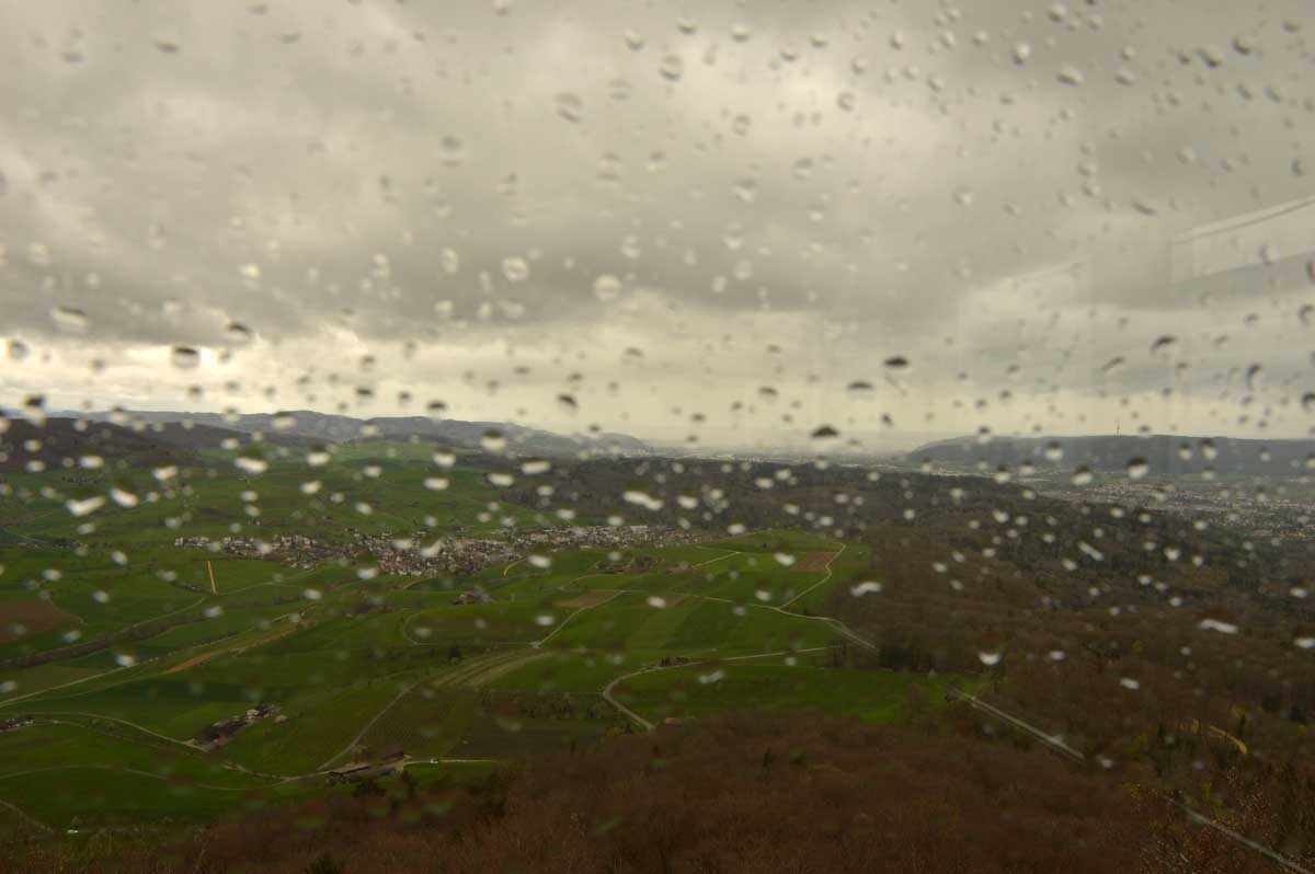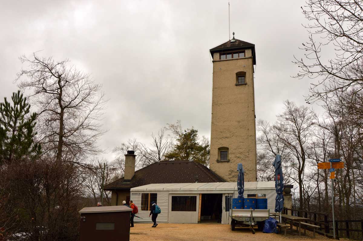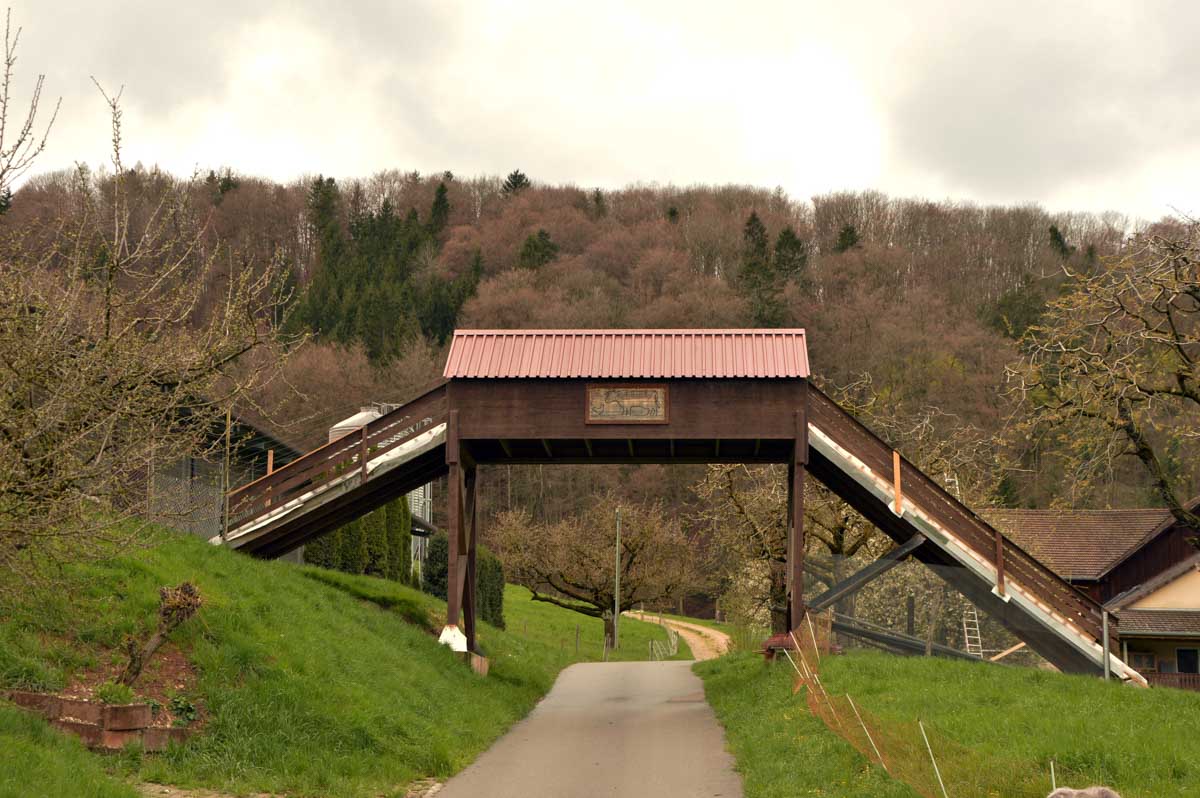 Nous allions apprendre par la suite que cette fois, nous avions commencé par la montée résiduelle dès le départ, pour arriver à la Tour du Sunnenberg et son impressionnant escalier en bois. Avec un vent à décorner les chèvres (foutons la paix aux bœufs pour une fois), nous avons, au travers des gouttes, profité de la vue sur le fameux trou de Bâle, dont la perspective se prolonge par le Haut-Rhin. Ben quoi, ce n’est pas moi qui ai inventé les noms. De l’autre côté dudit trou apparaissait la Forêt-Noire dans laquelle nous allions pénétrer le lendemain. Oui bon, il faut réviser sa géographie !