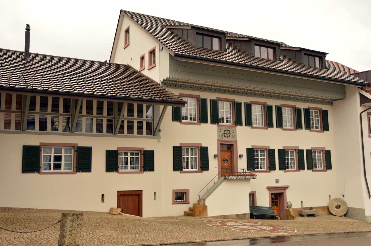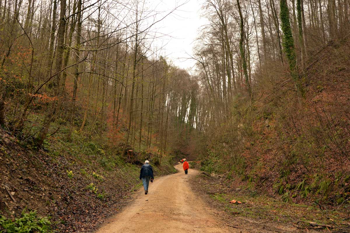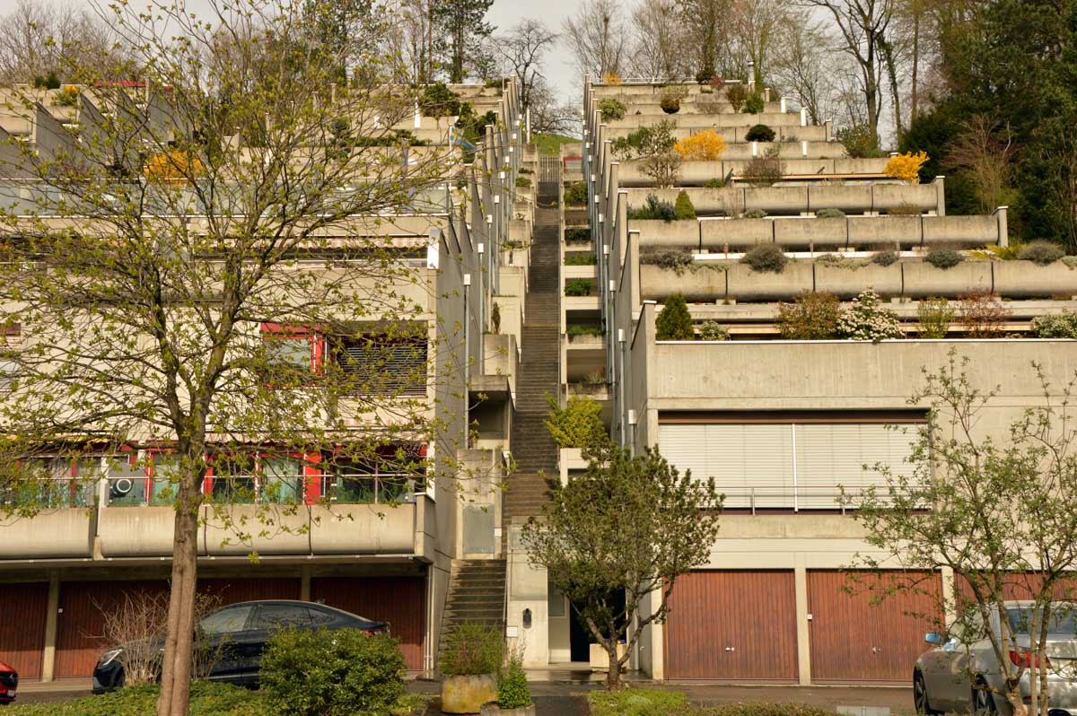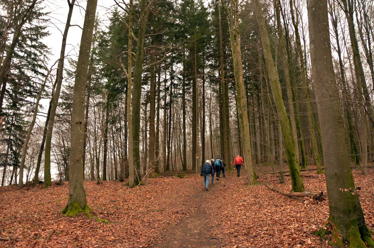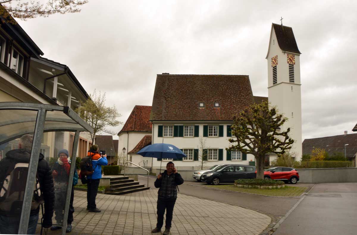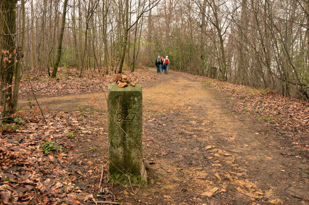 Nous allions apprendre par la suite que cette fois, nous avions commencé par la montée résiduelle dès le départ, pour arriver à la Tour du Sunnenberg et son impressionnant escalier en bois. Avec un vent à décorner les chèvres (foutons la paix aux bœufs pour une fois), nous avons, au travers des gouttes, profité de la vue sur le fameux trou de Bâle, dont la perspective se prolonge par le Haut-Rhin. Ben quoi, ce n’est pas moi qui ai inventé les noms. De l’autre côté dudit trou apparaissait la Forêt-Noire dans laquelle nous allions pénétrer le lendemain. Oui bon, il faut réviser sa géographie !