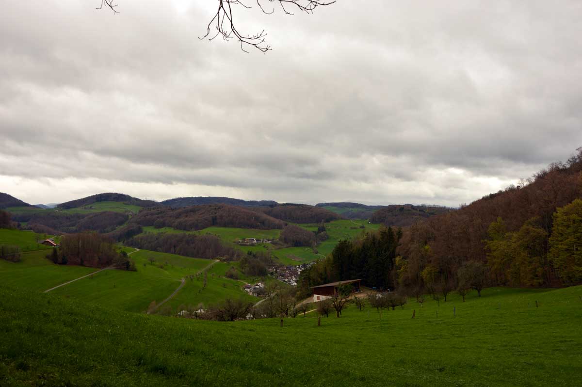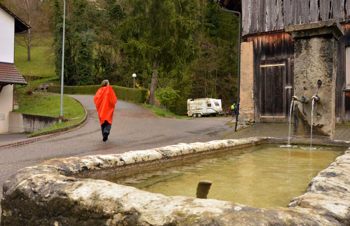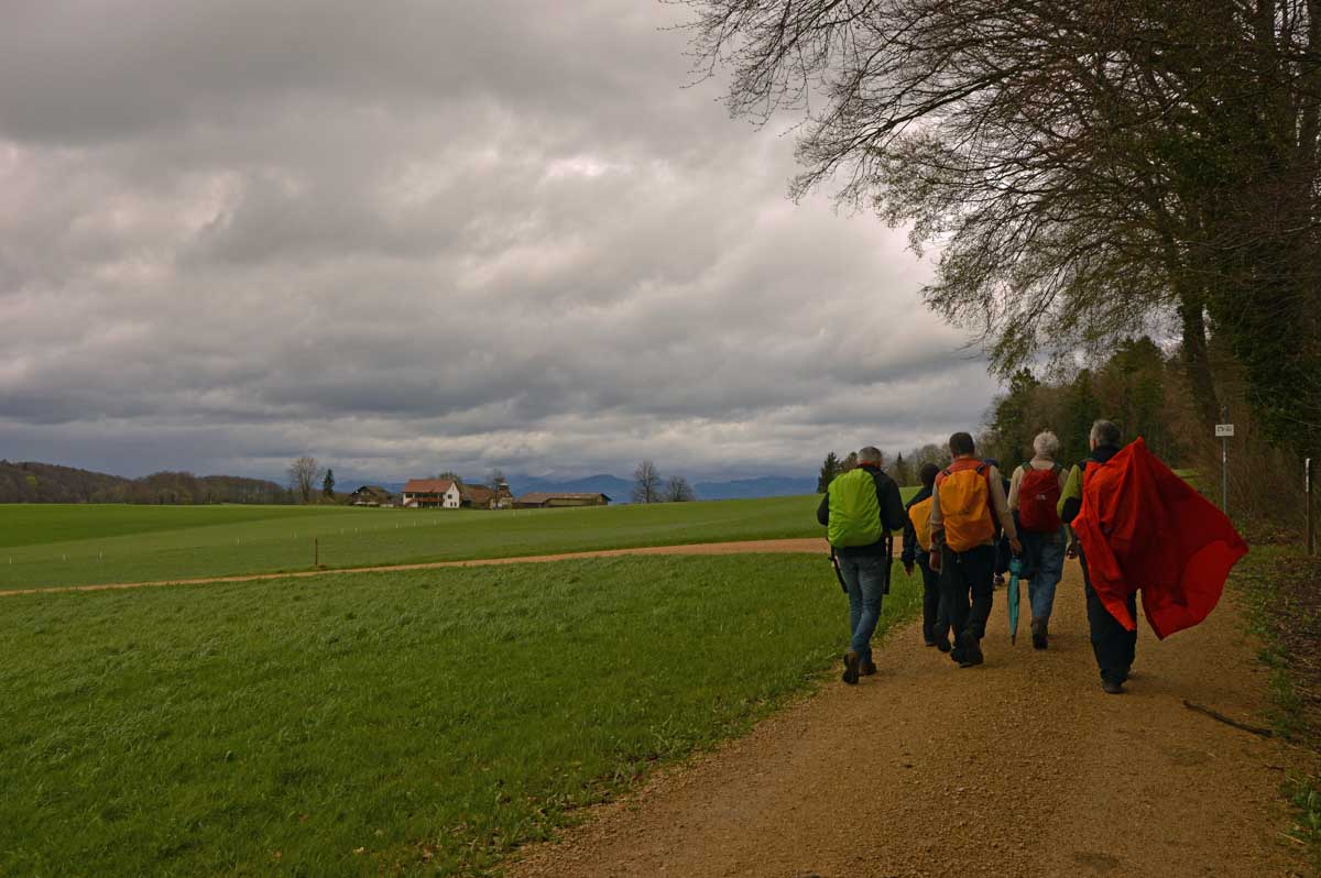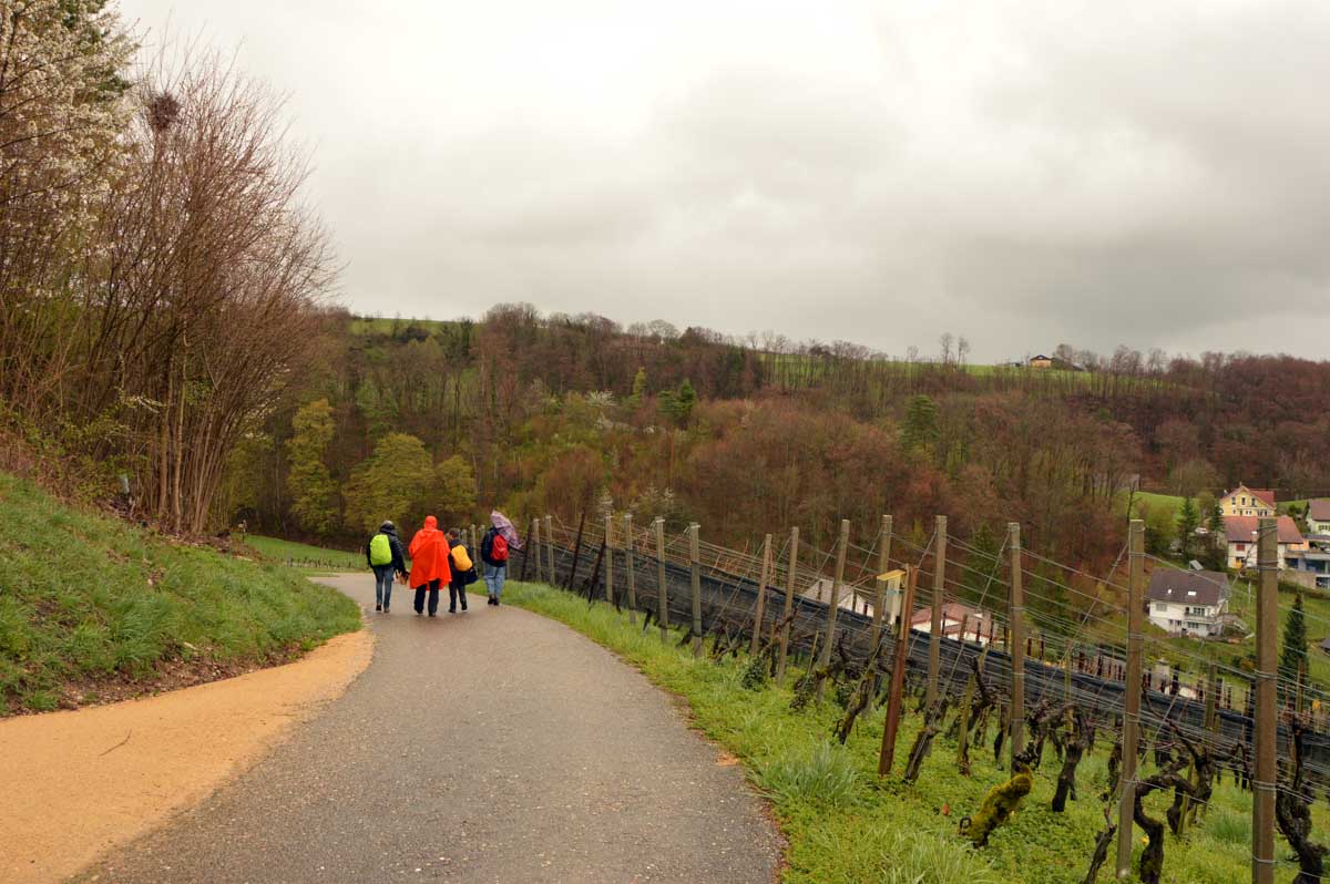 Les giboulées de mars, je veux bien, mais on est en avril, mon canard ! Et même eux, les canards, ils sont restés au sec. Mais bon, on n’est pas non plus des… hein, donc nous voilà propulsés dans la montée depuis Zeiningen. Alors on cape, il ne pleut plus, on décape, il repleut, on cape, on décape, moi j’étais toute décapée, à force !